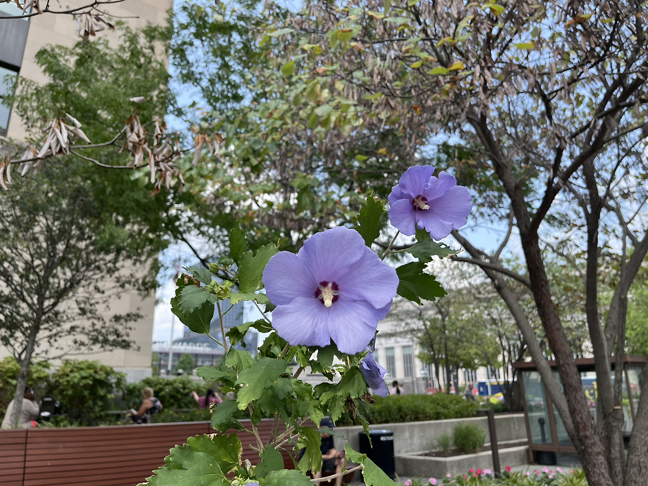 워싱턴에서 뉴욕으로 가는 중간에 필라델피아가 있다. 필라델피아에서 필라델피아 크림치즈를 먹기로 하고 아침 메가버스에 몸을 실었다. 버스에서 내리니 연보랏빛 무궁화가 나를 반겨주었다. 필라델피아에 와서 무궁화를 보다니, 그것도 푸른빛이 도는 무궁화는 처음이라 신기했다. 좋은 여행이 될 것 같은 예감이.