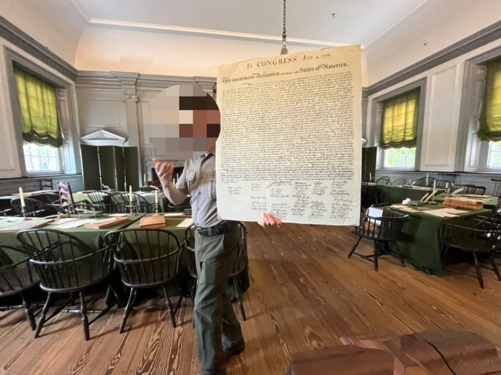 사실 들어가기 전에 방문자 센터에서 시간을 예약했어야 했는데 모르고 그냥 들어가서 입장객 줄에 섰다. 그 사실을 알고 예약하고 다시 와야 하나 했는데 관리하시는 분이 1명 정도는 괜찮다며 같이 들어갈 수 있었다. 인디펜던스 홀은 그냥 들어가는 게 아니고 미국 독립의 역사를 설명해 주시는 전문 가이드 분을 따라 들어간다. 내용도 너무 재미있고 생동감 넘치는 현장에서 미국의 역사를 배울 수 있어서 너무 좋았다.