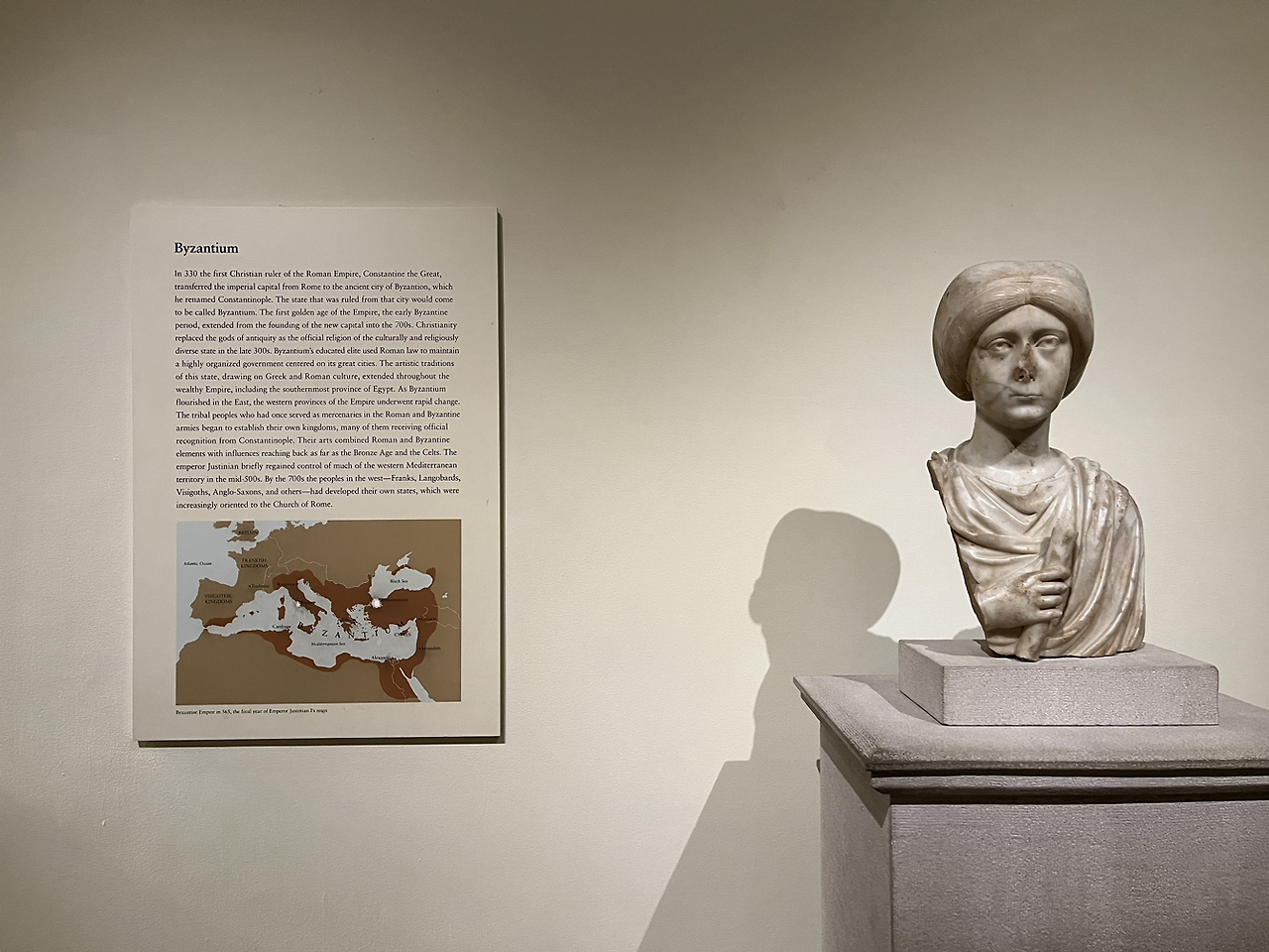 로마가 참 대단한 것이 정복 전쟁만 하는 줄 알았는데 그 과정에서 여러 문화가 서로 섞이도록 하는 역할을 하고 있었다는 걸 깨달았다. 그리스 안에 갇혀 있을 것 같던 그리스 문화는 로마를 거쳐 다른 나라로 전파되고 서로 융합되는 모습이 여러 조각상과 예술작품에서 드러났다. 비잔틴 문화는 로마 조각상들 보다는 정숙하지만 얼굴이나 복장의 정숙함에서 그 차이가 드러난다.
