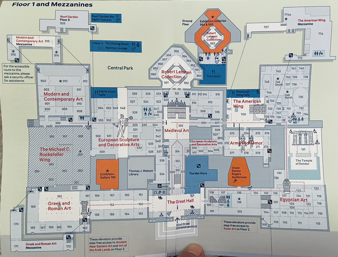 메트로폴리탄 전시관은 1, 2, 3층으로 이루어지는데 3층은 서브 방이라서 사실상 1-2층만 돌면 된다. 근데 한 층의 한 방만해도 볼 것이 너무 많아서… 1층 로비에서 반드시 지도를 챙기기 바란다. 홈페이지에는 아예 구글 지도를 제공하고 있다. 메트로폴리탄 미술관이 이렇게 넓은 줄 몰랐던 본인은 Medieval Art에서 한차례 길을 잃은 후 방마다 표시된 번호를 읽으며 하나씩 흝어야 한다는 것을 깨닫고 관람 일정을 빠르게 짰다. 일단 모던 아트 쪽은 뉴욕현대미술관도 있으니 패스하고 Greek and Roman Art - Medival Art - Europian Sculpture - Arms and armor - Egyptian Art - American Wing 순으로 관람을 하다가 2층으로 올라가기로 했다. 메트로폴리탄은 방마다 다른 방으로 통하는 길이 2개 이상이고 테마마다 방이 수 개이기 때문에 입구마다 있는 방 번호를 잘 읽으며 돌아다니지 않으면 길을 헤매기 쉽다. 길을 헤매면 설마 빠져나오지 못하는 일은 없다만 한번 본 방을 또 관람하는 시간 낭비를 할 수 있다. 정말 방 하나를 1-2분 안에 샤샤샥 보지 않으면 이 많은 방을 다 구경하는 건 불가능하다. 문제는 방 하나만 하더라도 미술 좋아하는 사람은 한 번쯤 보았을 그런 그림과 조각들이 즐비하기 때문에 진짜 눈이 깜박이고 발이 아픈 내가 원망스럽더라. 몸은 혹사할 수 있지만 시간은 멈추어 세울 수 없기 때문에 메트로폴리탄에 들어간 순간부터 폐관 시간까지 정말 쉬지 않고 부지런히 구경했던 것 같다. 하지만 1분과 1초만 더 남았더라면 좋았을 것 같다는 진한 아쉬움이 남는다.