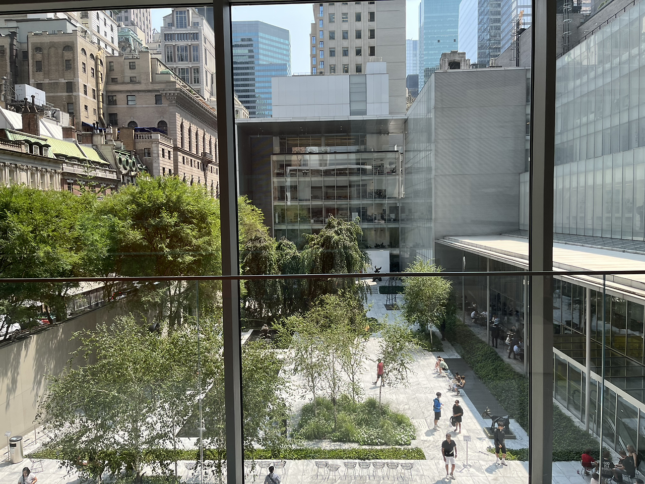 관람을 하다 보면 사람들이 창 앞에서 한참 서 있는 걸 볼 수 있는데 사방으로 난 창으로 본 맨해튼의 풍경 자체도 참 예술적으로 보였다. MoMA의 건물은 강을 끼고 디귿 자로 만들어져 있는데 가 사이에 작은 정원에서 사람들이 쉬어 가는 공간을 두었다.