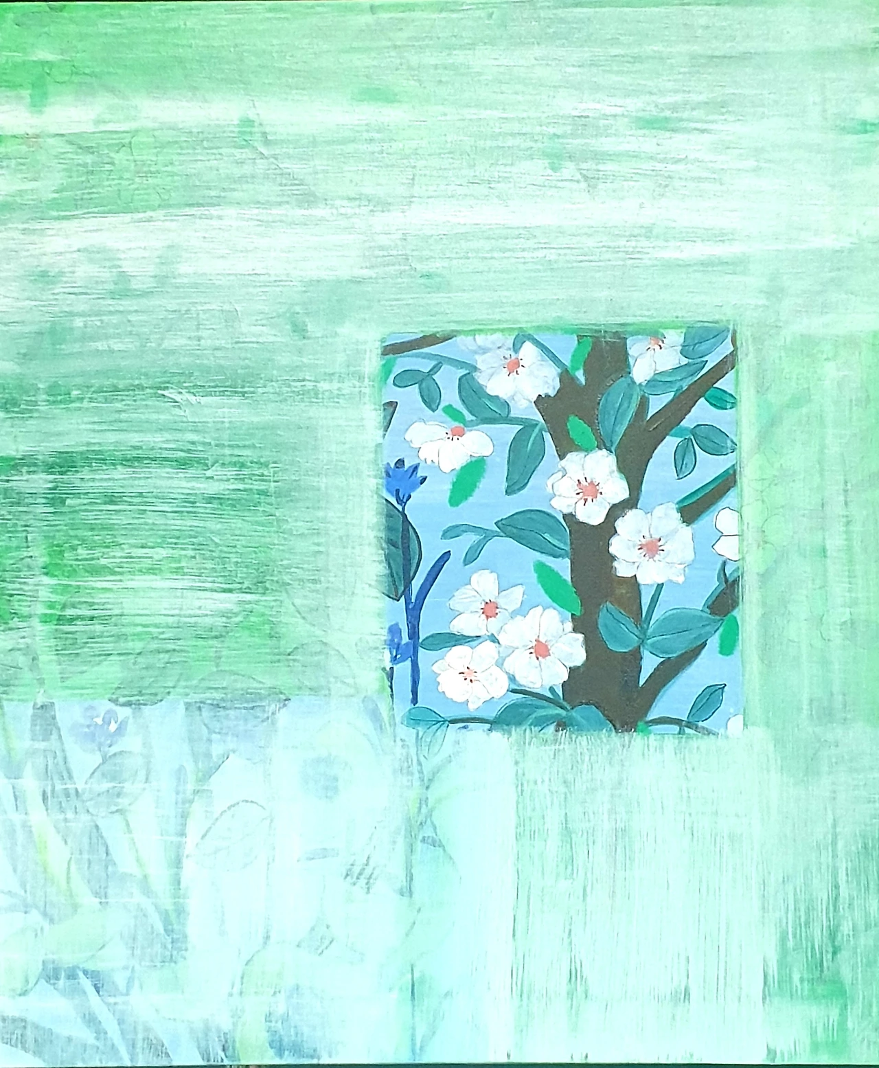 캔버스에 꽃을 그린 뒤 삼베로 덮어주듯 색을 올렸다.