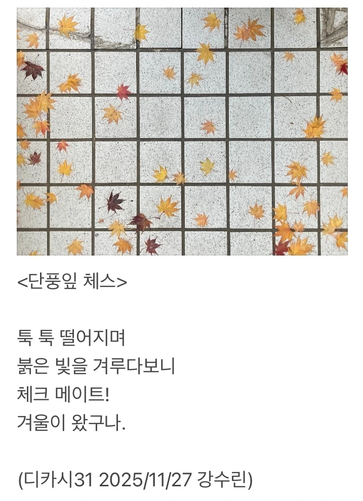 생각해보면 어리고 젊을 땐 추워도 가을 옷을 입었다. 이제는 조금의 추위도 싫어서 가을 옷을 안입는다. 가을이 짧아진게 아니라 내 마음이 여유가 없는건가보다. 추우면 몸이안좋아 질까봐 그게 싫어서 멋보다는 건강이어서. 자꾸움츠러든다.