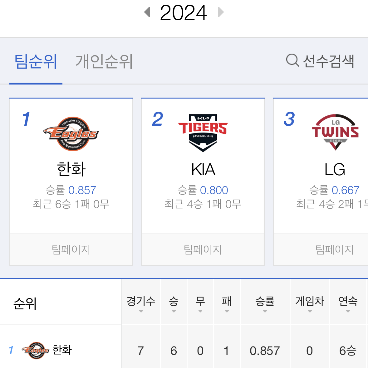 아직 7경기 밖에 하지 않았지만 이 순위표를 믿을 수가 없어서 캡처했다. 주위의 한화 팬들의 인스타그램 스토리와 카카오톡 배경화면이 이 순위표로 바뀌고 있다는 이야기가 주위에서 들려온다.
