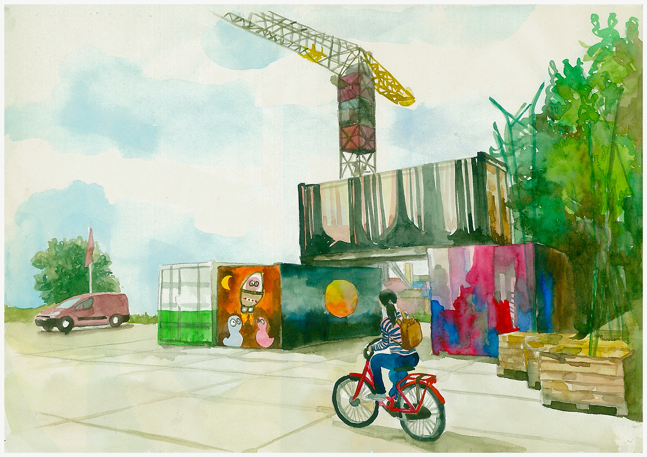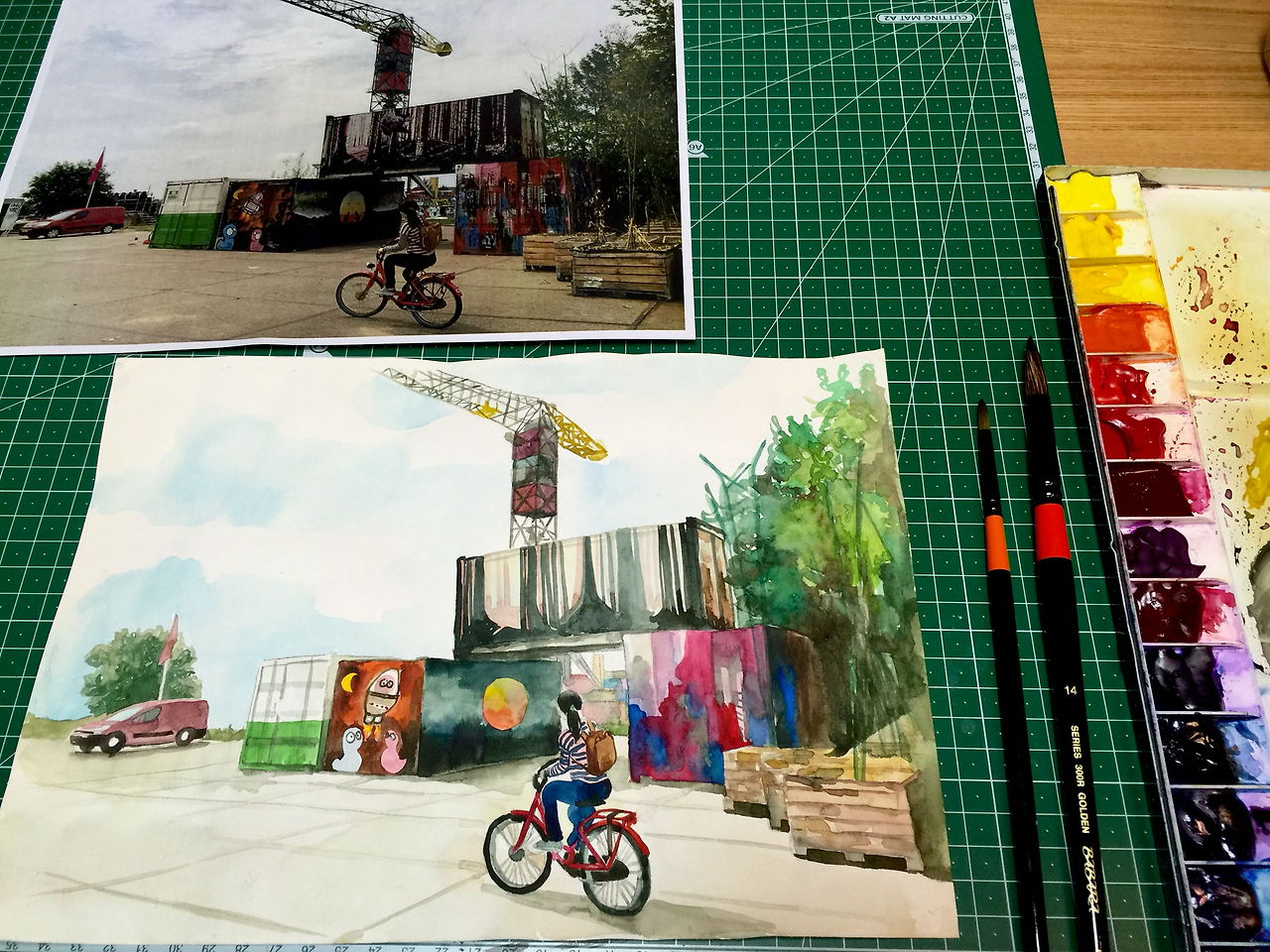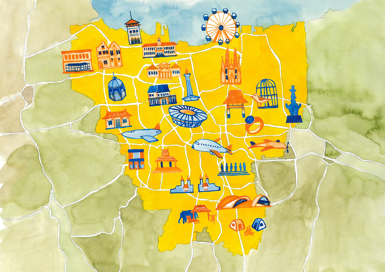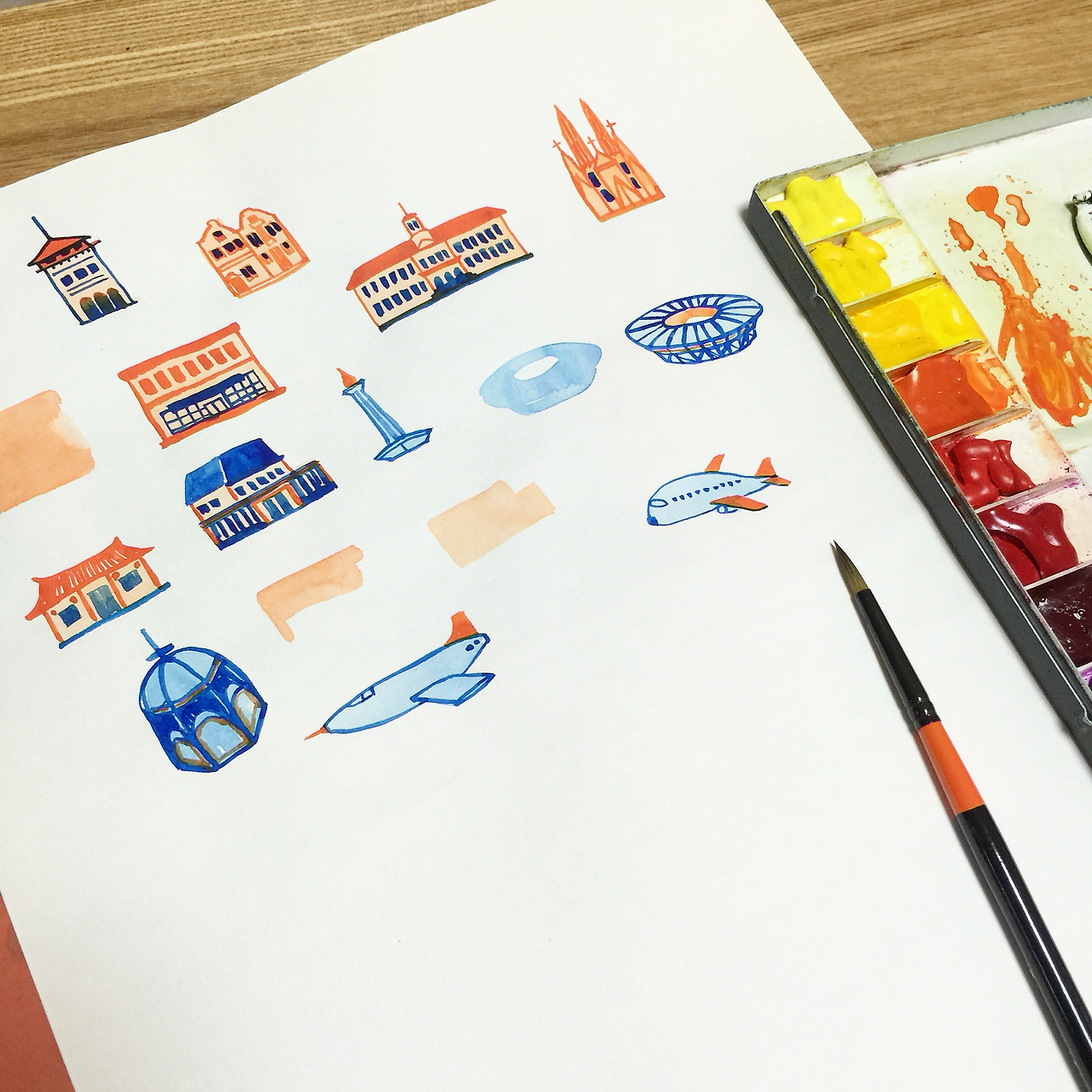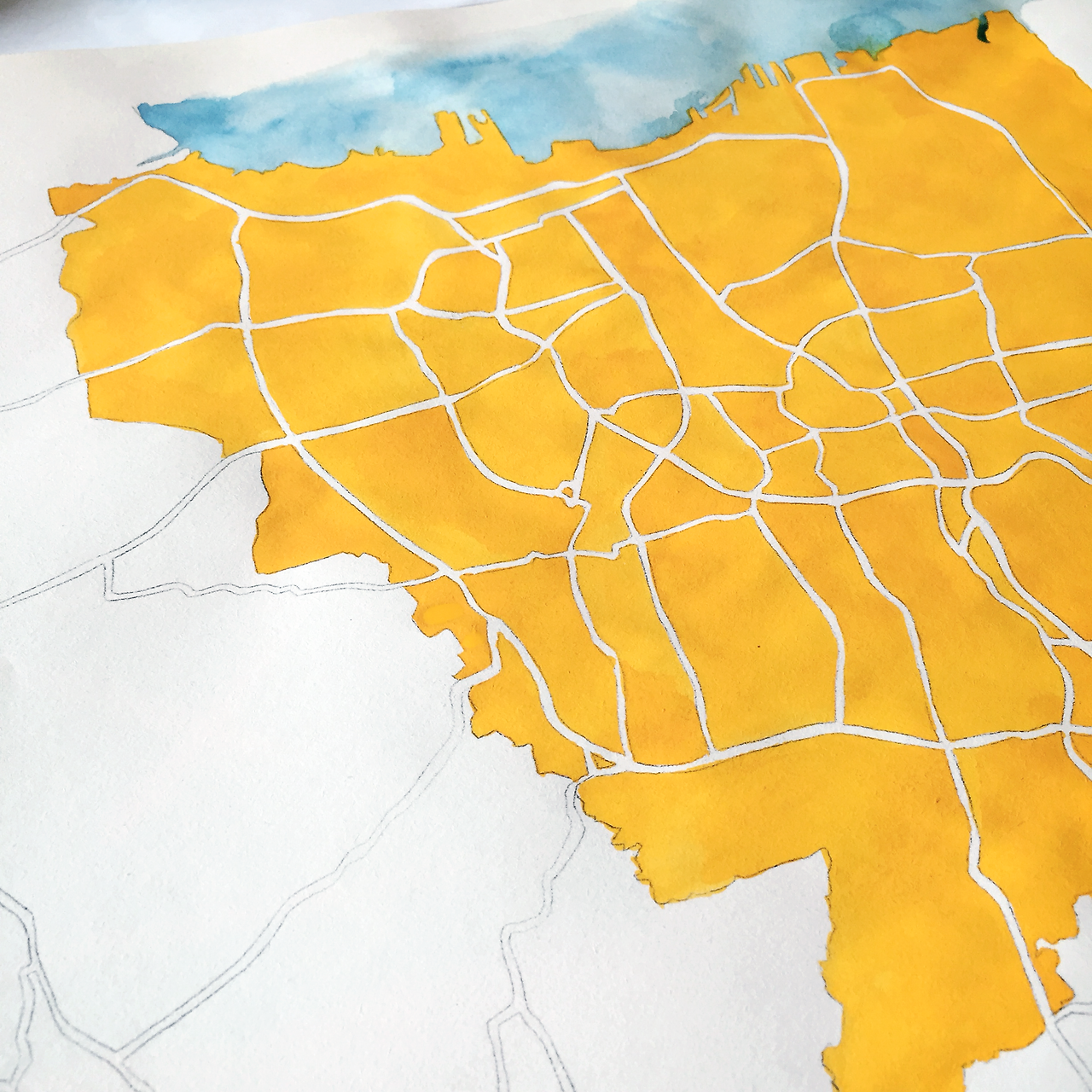 지도를 눈대중으로 똑같이 그릴 자신이 없어서 이때 먹지를 활용했었다. 구글 지도에서 도시를 출력하고 먹지를 대고 선을 딴 다음에 수채화로 칠했다. 그리고 스팟들은 따로 끄적끄적 그린 후 포토샵으로 지도에 붙였다. (감쪽같죠?)