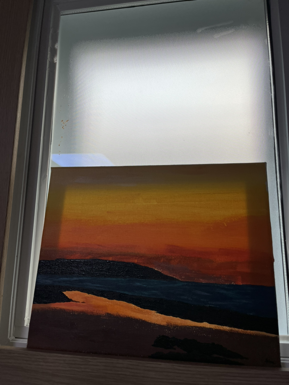 이호동네 밖으로 나갔다. 아침에 일어나 방청소를 했다. 처음부터 청소해야지,라고 계획했던 것도 아니었다. 딸과 아들의 사진이 담긴 액자를 방구석구석 빈틈에 진열했다. 작은 창문 앞에는 딸이 그려 준 저녁노을 그림을 놓았다. 햇살이 들어오는 8절 도화지 크기만 한 작은 창문 앞이다. 유리로 된 창이지만 열리지 않는 창이다. 그림에 태양빛이 살짝 비추이니 저녁노을이 더욱 노을답다. 영화를 보기에 딱 좋은 크기의 텔레비전으로 넷플릭스 영화감상할 준비도 했다. 화면을 가렸던 천을 치웠다. 텔레비전 앞에 진열했던 십여 개의 액자를 다른 곳곳에 세웠다. 이제 가끔은 식사시간에 영화도 볼 여유를 갖기로 했다. 이호 바다가 보이는 베란다도 정리했다. 옆건물 방에서 바라볼 때 보이지 않도록 강아지 그림이 있는 천으로 창을 가렸다. 원형 철재 테이블과 철재 의자 두 개를 가지런히 놓았다. 바다가 보이는 카페 분위기가 느껴진다. 원형테이블 위에는 아들이 생일 선물로 그려 준 그림을 놓았다. 강아지 미소와 내가 웃는 모습이 담긴 그림이다.