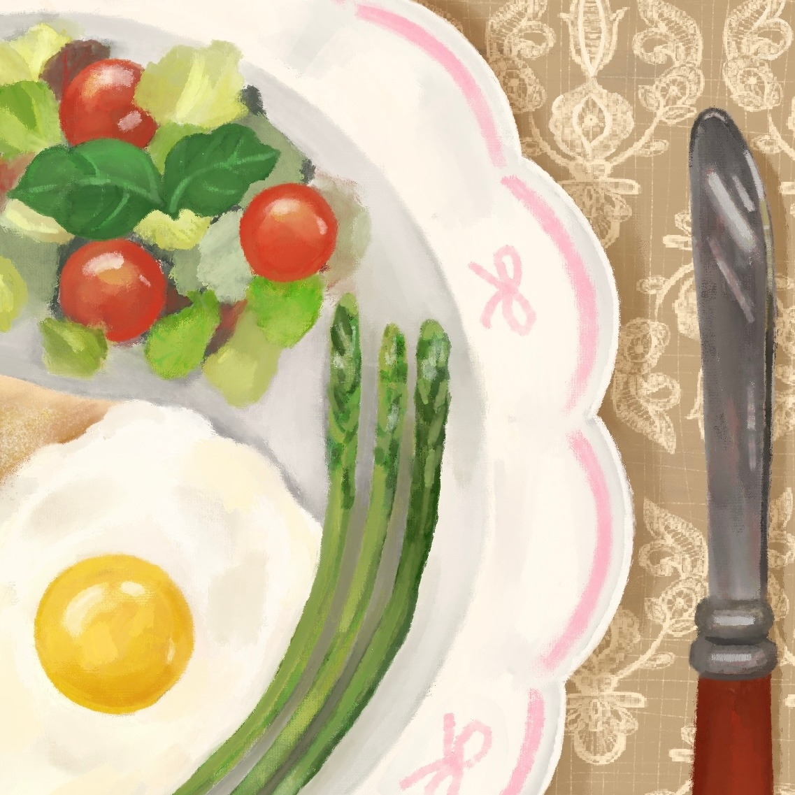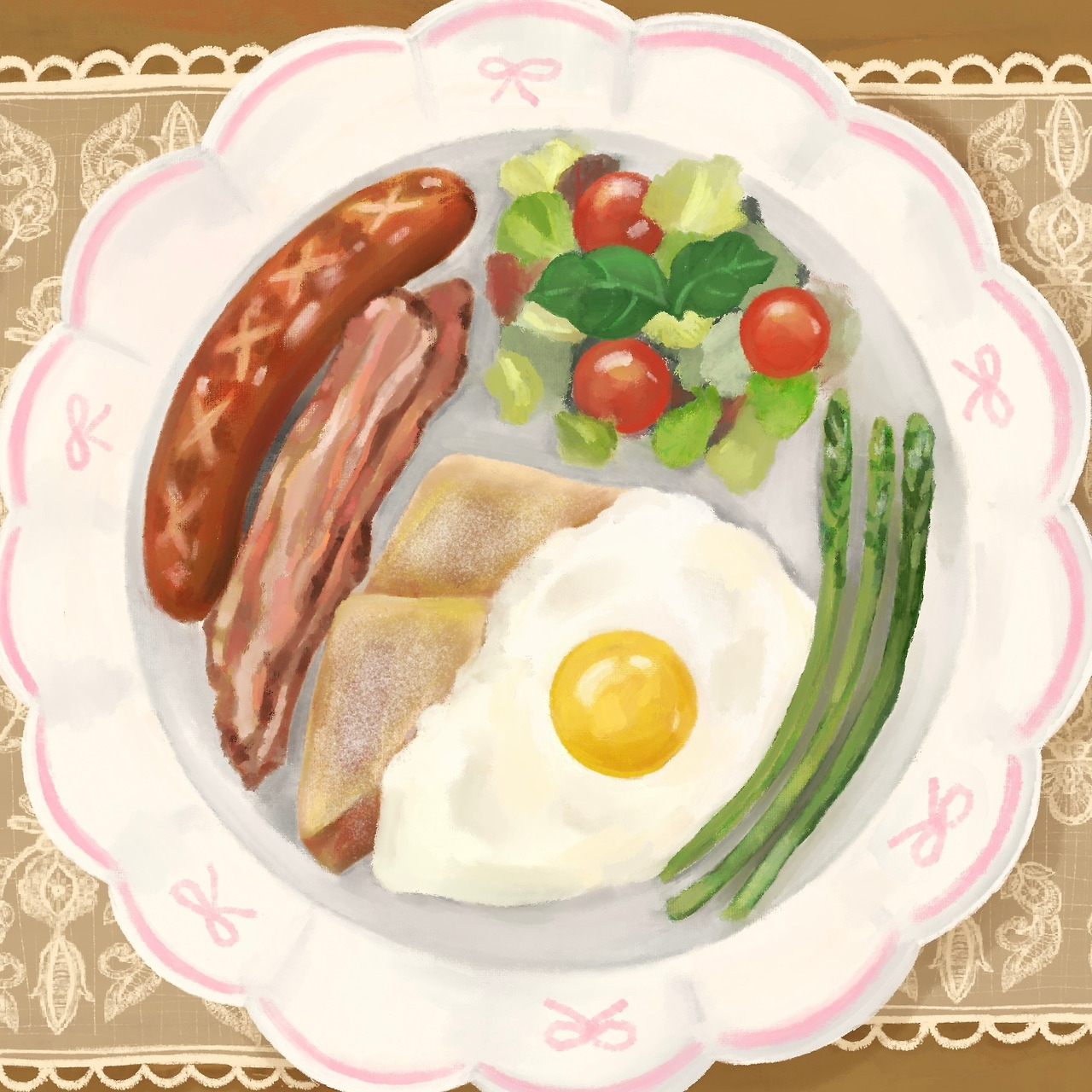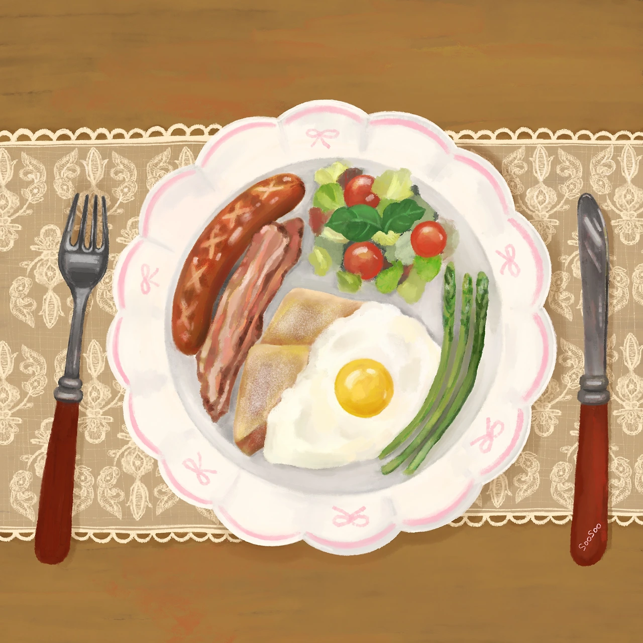 모든 준비가 끝나면 리본이 그려진 예쁜 접시에 음식들을 옮겨주고 레이스 테이블보가 깔린 식탁 위에 놓아줍니다.