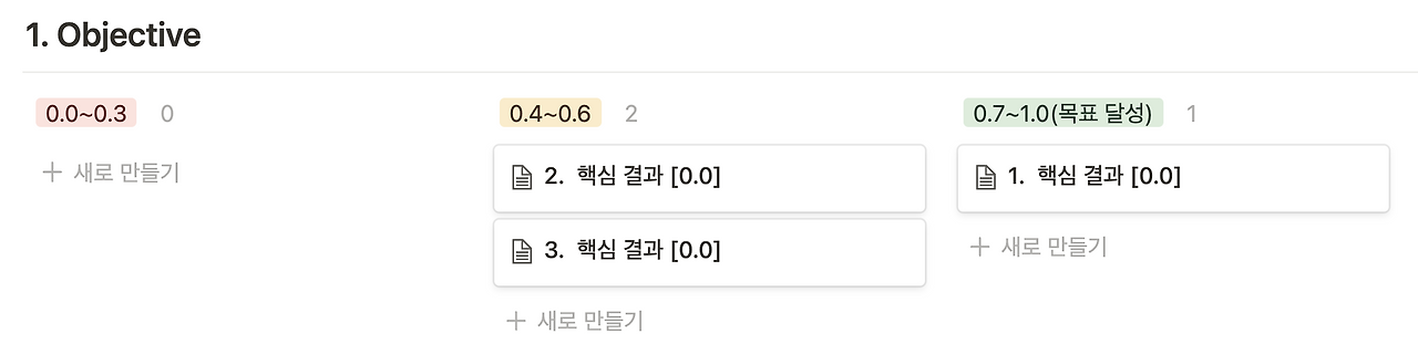 3. 핵심 결과의 달성 수준에 맞추어 보드를 이동하여 전체 달성 현황을 한눈에 파악할 수 있다.