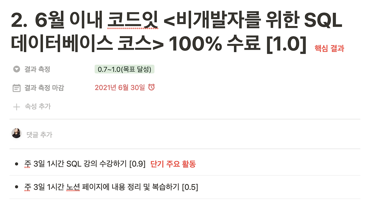 반면, 2번 핵심 결과의 경우에는 [1.0]라는 높은 달성률이 나왔는데, 강의를 반복적으로 듣다보니 관성이 생겨서 지속적으로 실천하는 게 가능했기 때문이다. 그럼에도 불구하고, 다음번에 작성하는 핵심 결과는 좀 더 ambitious 하게 설정해야 할 것으로 보인다.