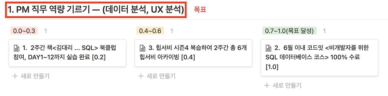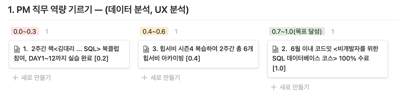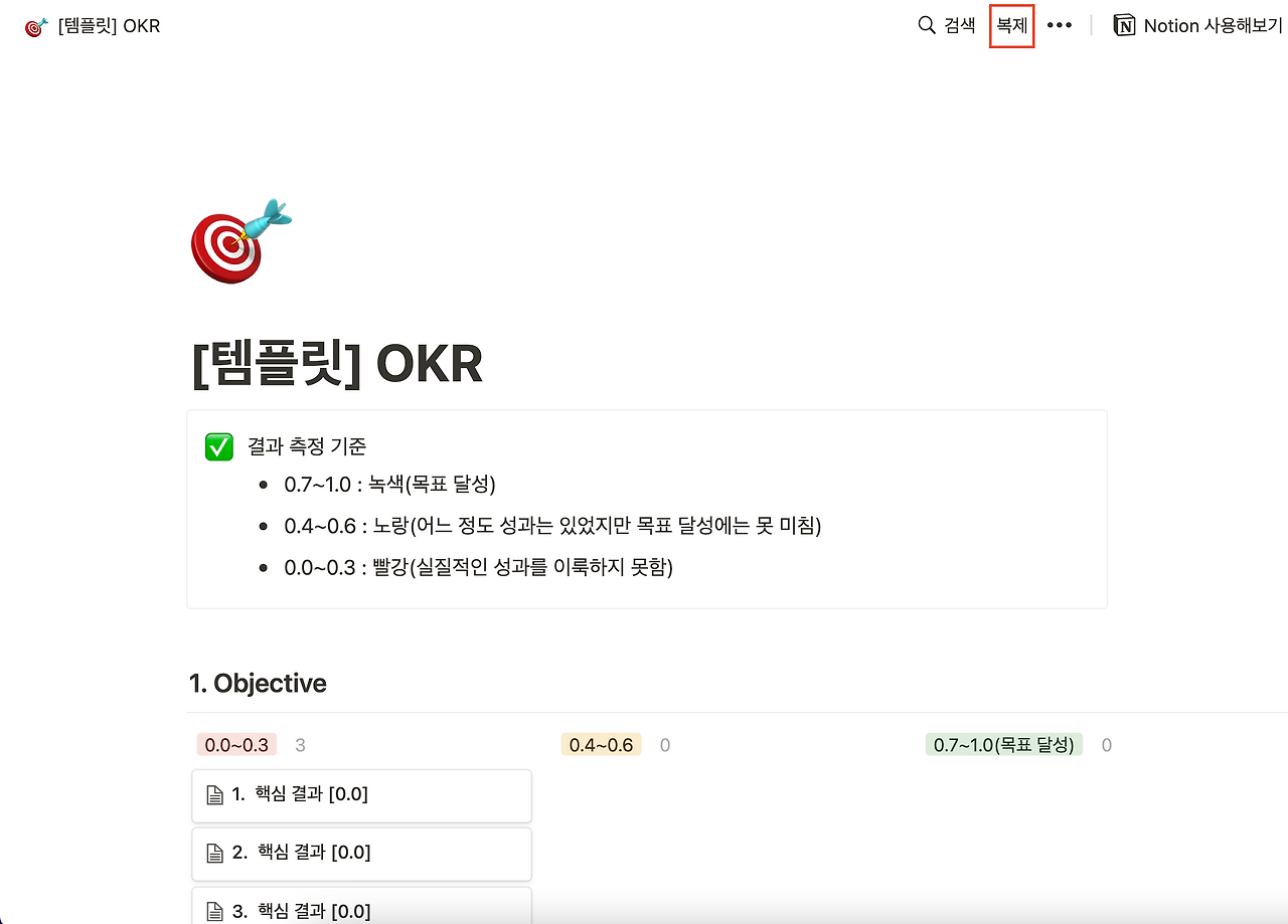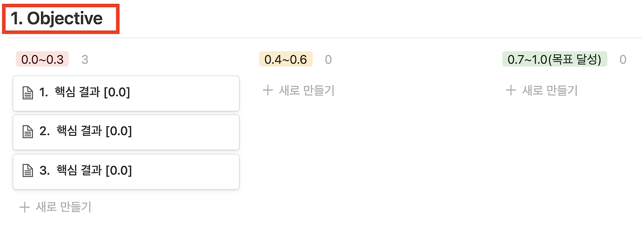 처음부터 작성한다는 가정 하에, 이전에 작성한 Personal OKR를 노션 템플릿에 옮겨보자.