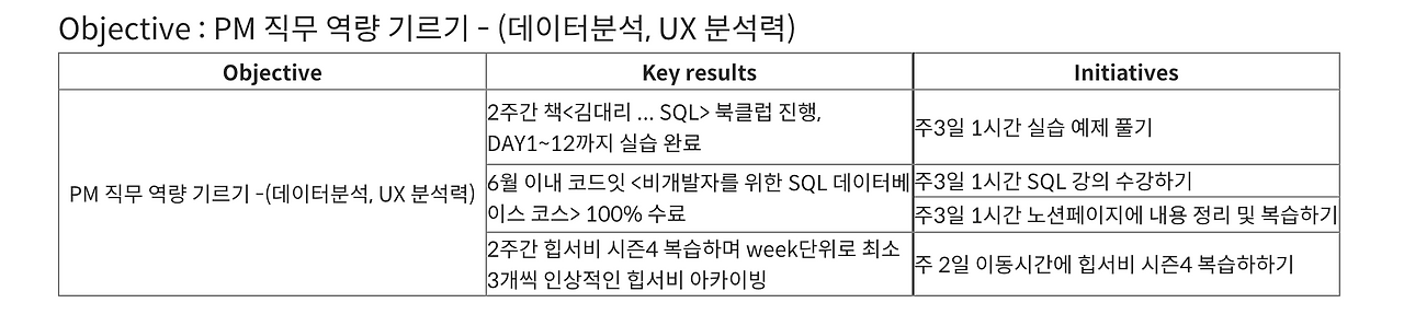 당시 나는 PM으로서의 직무 역량인 데이터 분석 능력과 UX 분석 경험을 쌓는 것을 목표(Objective)로 위와 같은 OKR을 작성했다.
