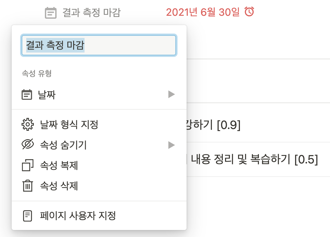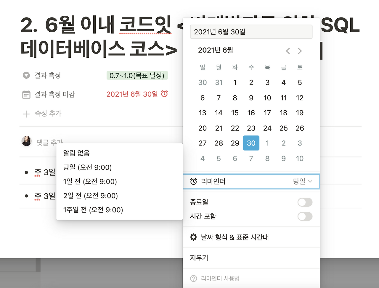 리마인더를 활용하면 결과 측정 시기를 놓치지 않을 수 있다. '속성 유형'을 '날짜'로 선택하고, 캘린더에서 날짜를 선택 후 '리마인더'를 설정하면 된다.