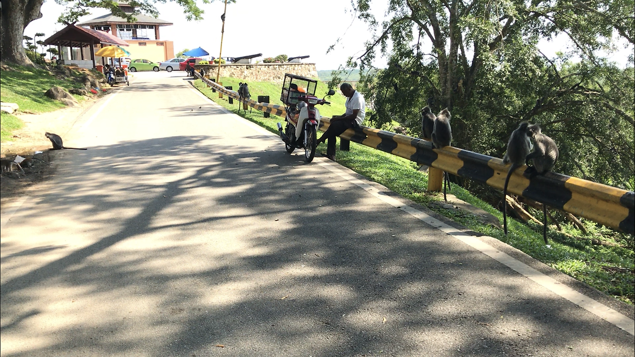 이 정도 전경이면 얼마나 공포스러운지 감을 잡으시려나? 먹이 파는 아저씨 둘러싼 원숭이들. 여기 앞에 들렀다 가면 원숭이들의 표적이 된다.