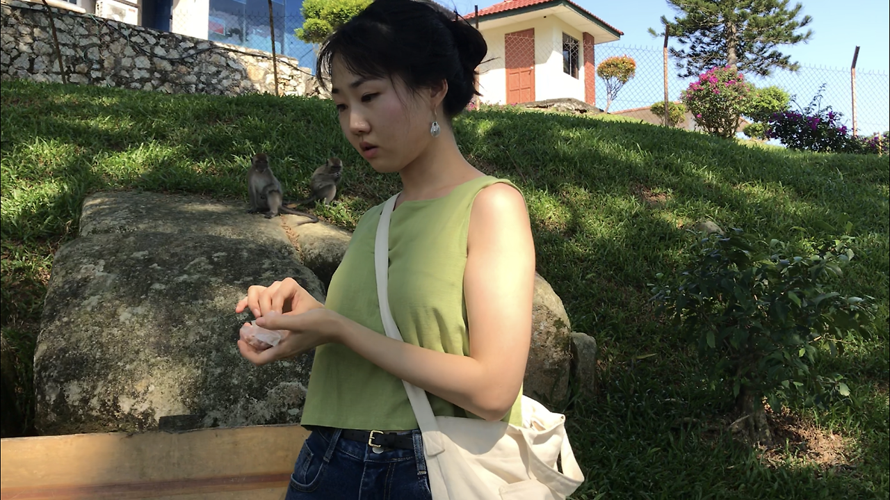 원숭이가 자꾸 날 향해 다가오길래 먹이 봉투를 원숭이님께 고이 건네 드렸다. 아래 고구마 있는 비닐봉지가 내가 들고 있던 먹이 봉투.