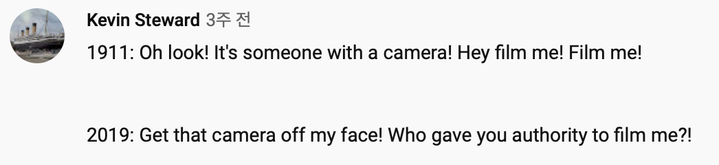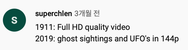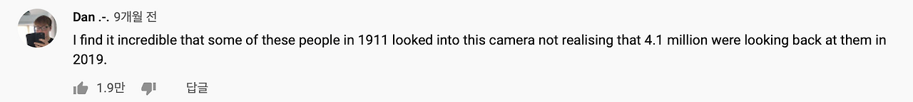 "1911년 이 카메라를 쳐다봤던 사람들이, 2019년에 410만 명이 이 영상으로 그들을 볼 거라고 생각하지 못했다는 게 소름돋는구먼"