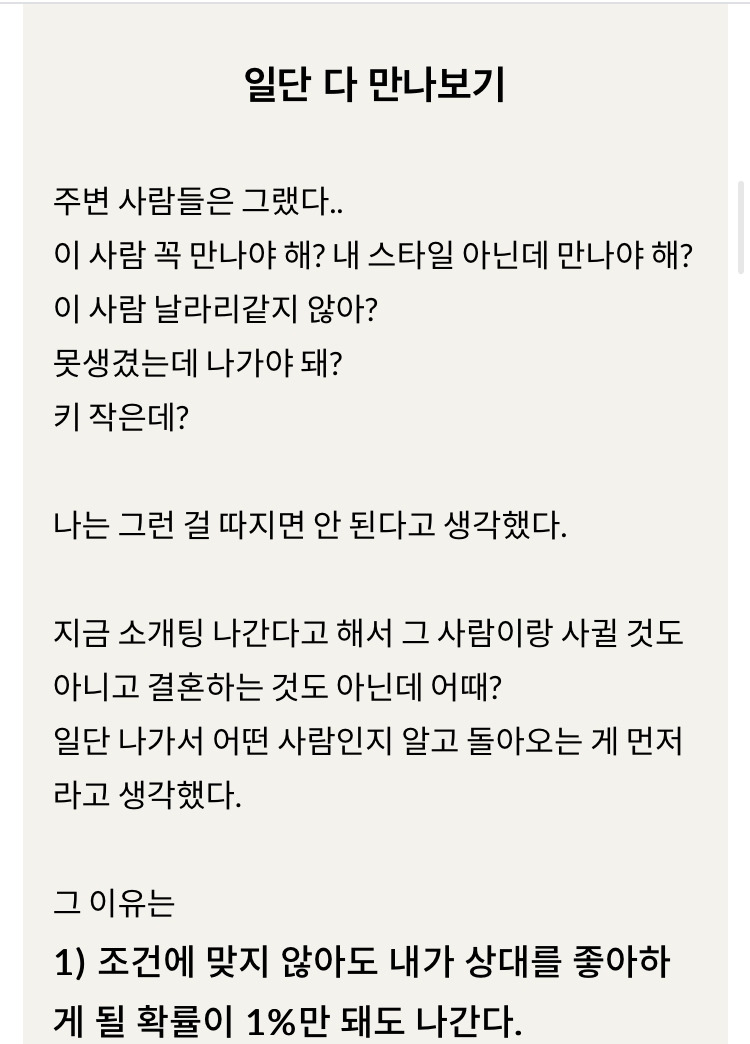 그리고 여기는 여자는 돈 안내는 건데 남자는 돈 내라고 시키는 구조다. 중간에 매칭매니저가 사람 소개해주는데 여자한테는 OK하라고 시킨다. 오케이 했다가 이상한 사람 많이 매칭돼서 귀찮았다.
