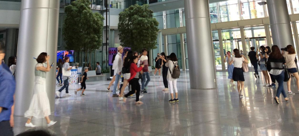지하식당에서 밥을 먹고 1층 로비로 올라가면 12시 10분쯤. 심상치 않은 분위기다. 가만히 있을 수 없다. 로비에 값비싼 카메라를 든 팬들이 가득하다. 회사 1층 출입구엔 저지선이 그어져 있다.