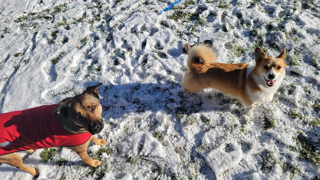 아침 식사 후, 두 시간을 기다렸다가 뒷마당으로 나갔다. 아침 내내 기다려왔던 공놀이를 시작한 만두와 하나는 최고로 신이 났다. 눈 밭을 이리저리 뛰어다니며 공을 물고 오는 아이들을 바라보는데 나도 모르게 얼굴에 미소가 어렸다.