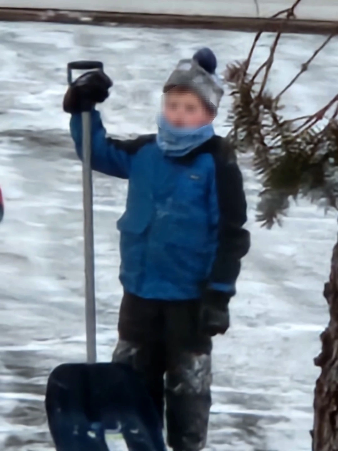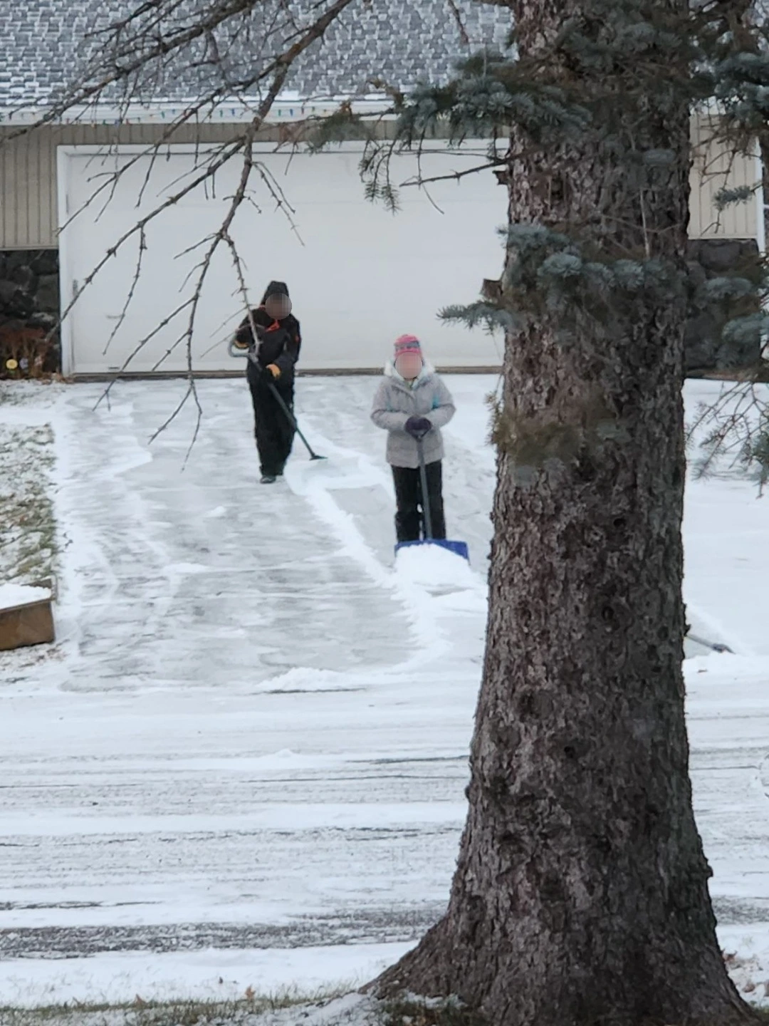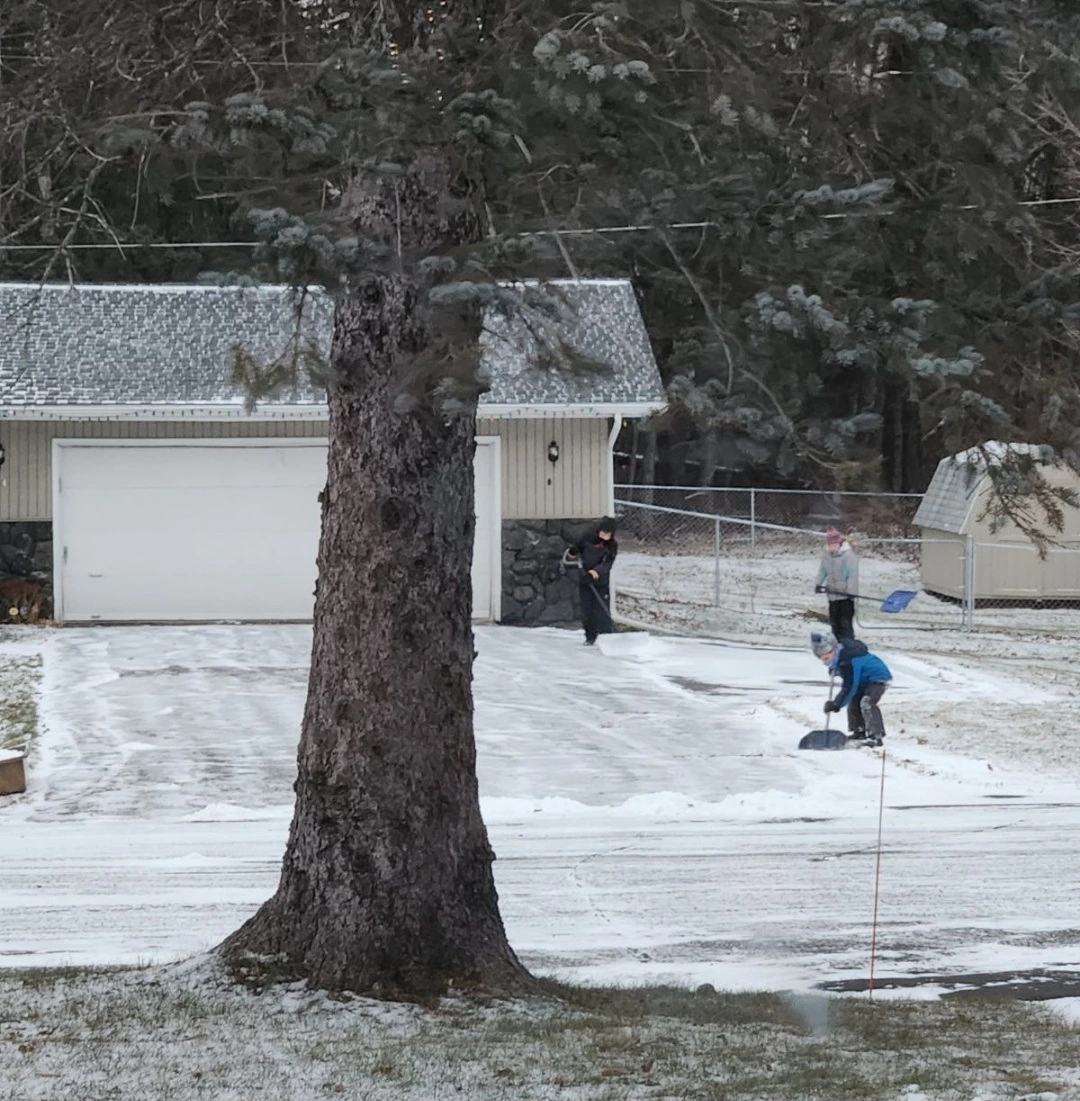 [너희가 집에 있는지는 모르겠는데, 지금 아이들 세 명이 너희 집 드라이브 웨이를 치우고 있어.]