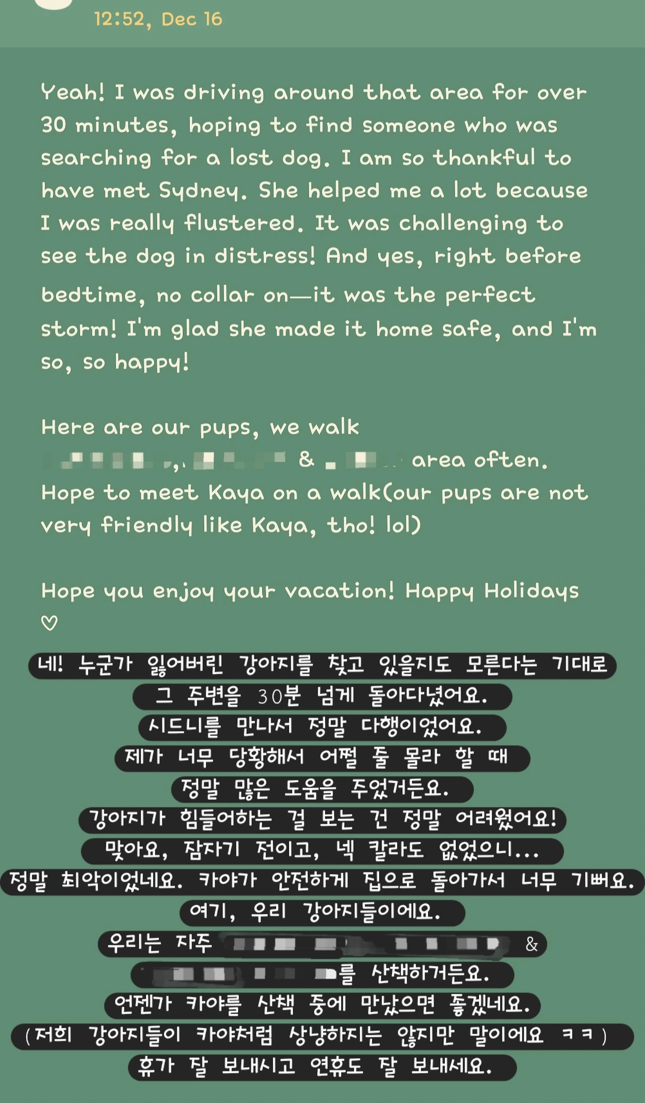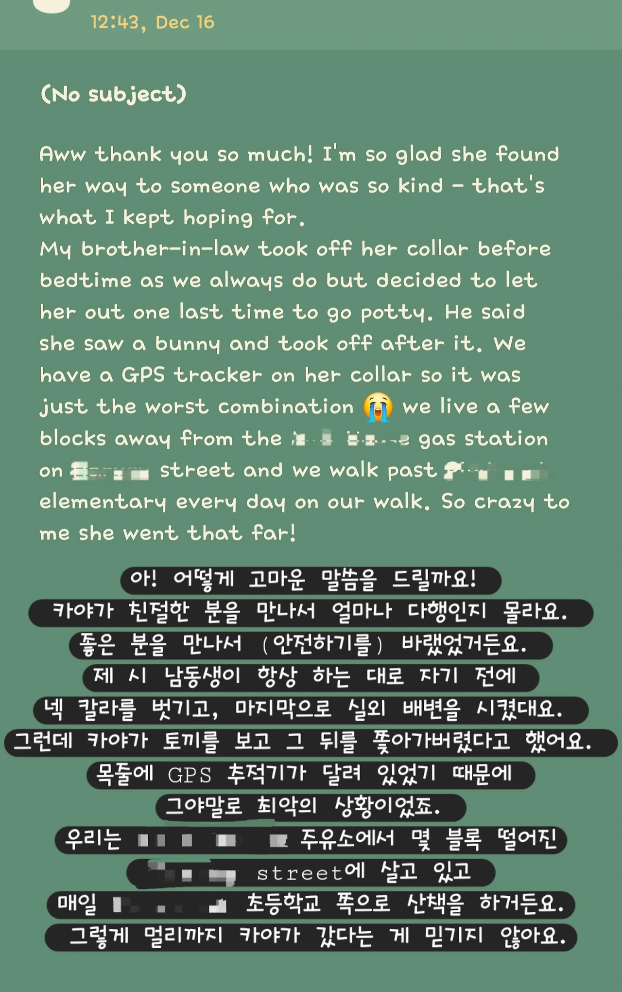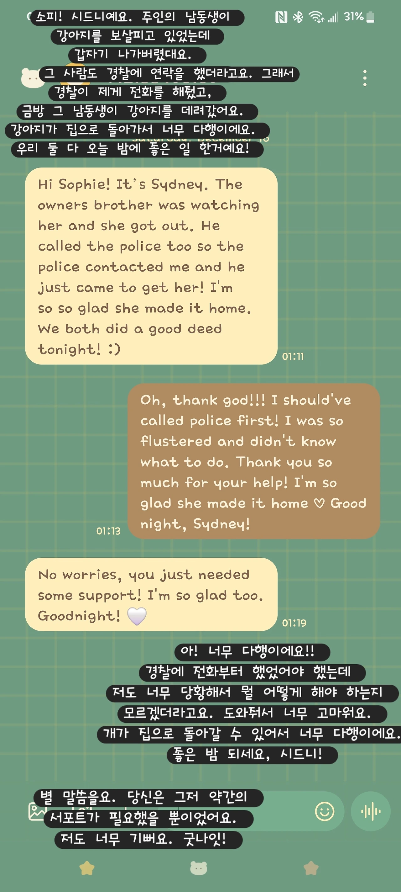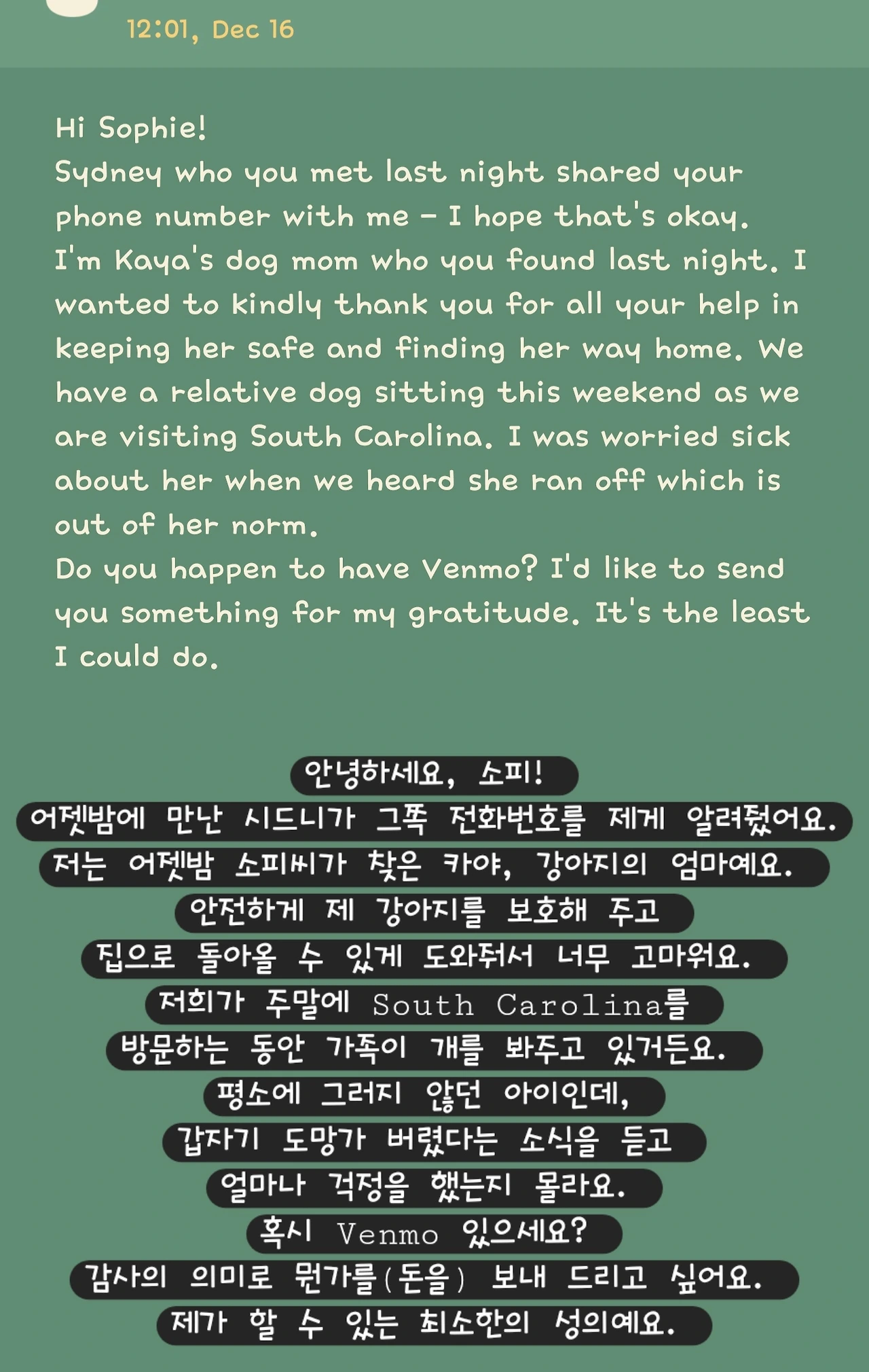 "개가 안전하게 집으로 돌아갔는지 알고 싶어서 그러는데, 혹시 나중에 제 번호로 연락 좀 주실 수 있으세요?