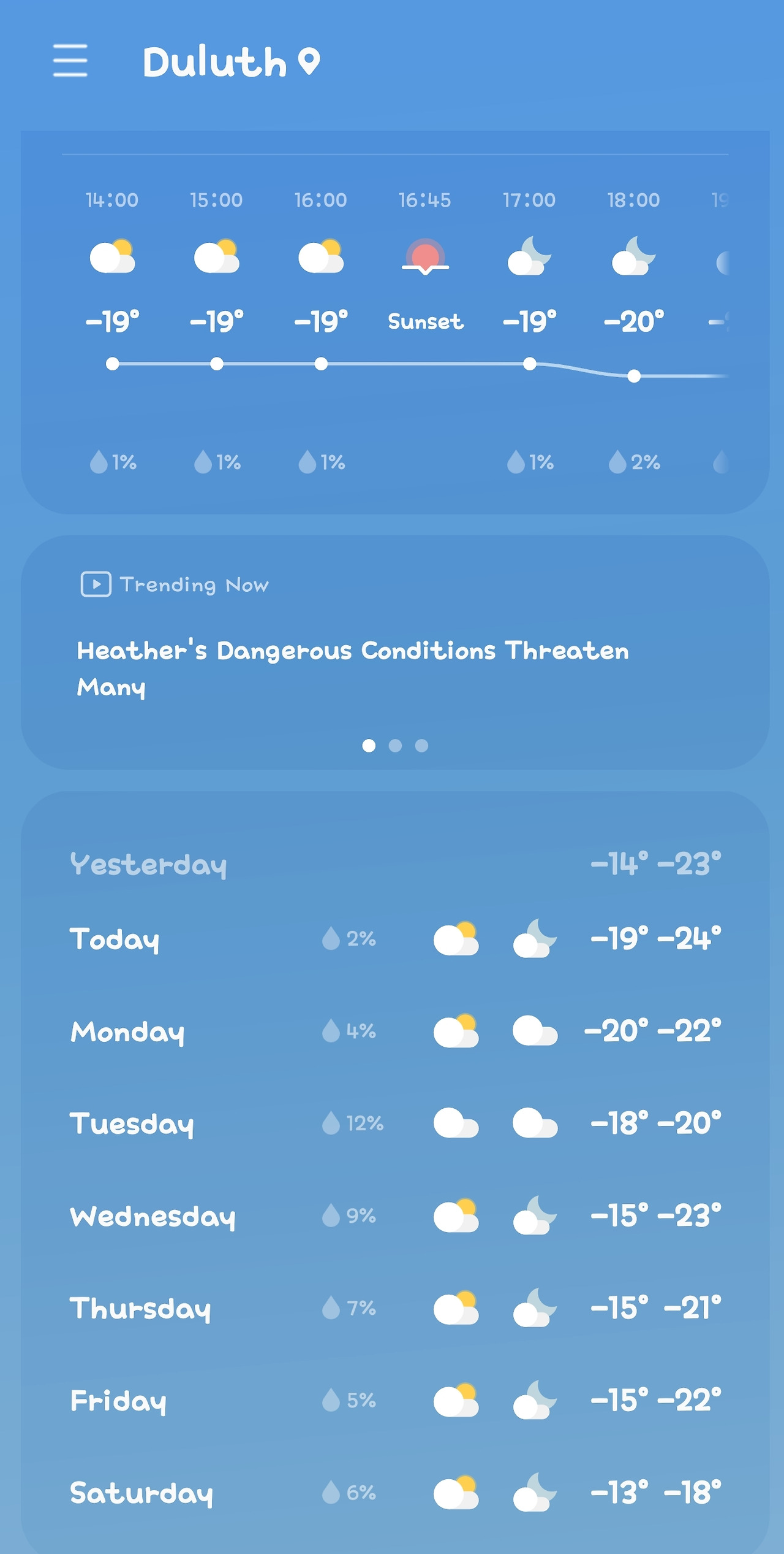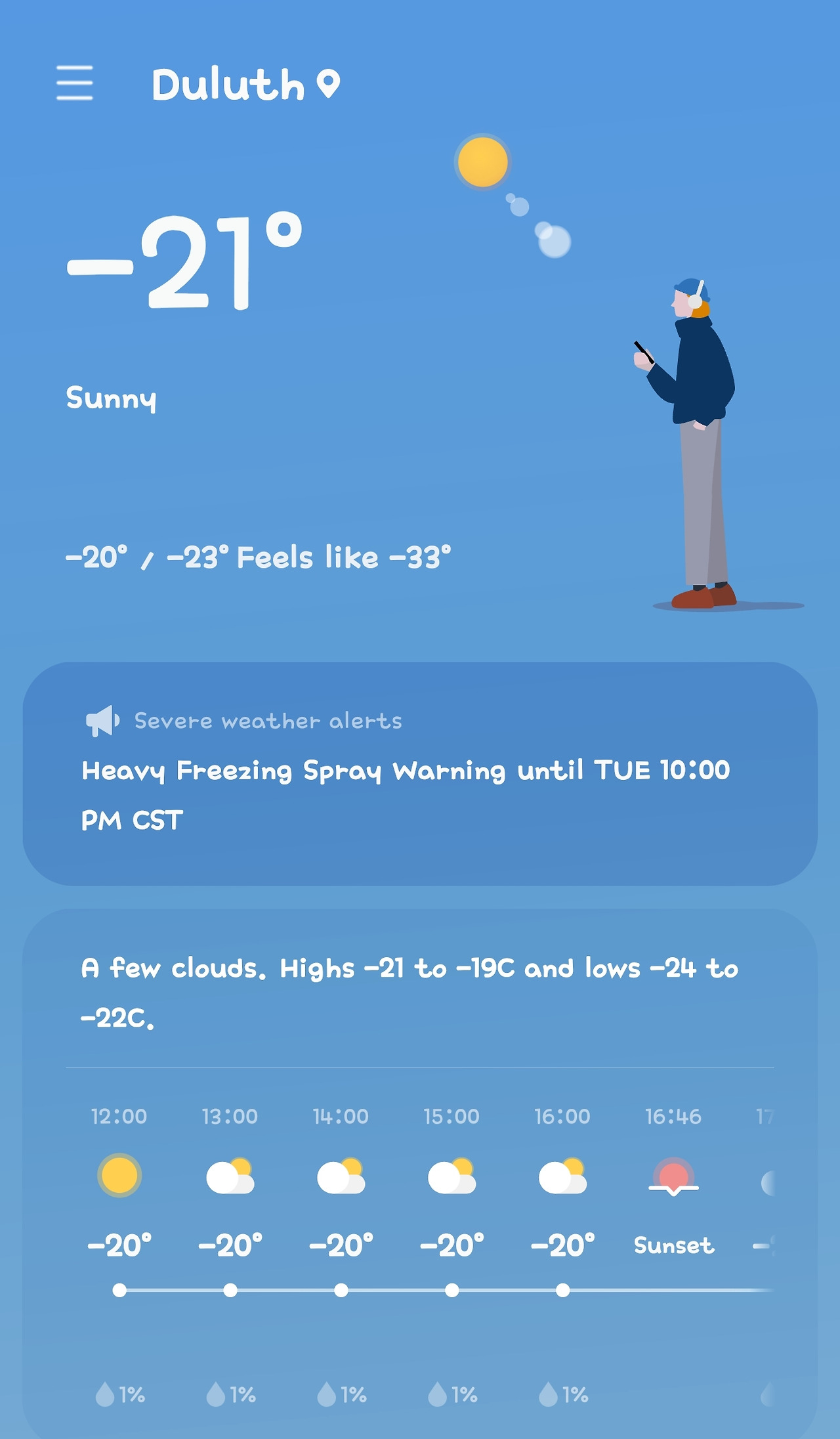 낮 기온은 영하 15도에서 20도, 밤에는 영하 25도까지 떨어지는데 체감온도는 영하 30도에서 40도 정도 된다. 한마디로 맨살로 3초 이상 있으면 피부가 떨어져 나갈 것 같은 그런 날씨라고생각하면 된다.