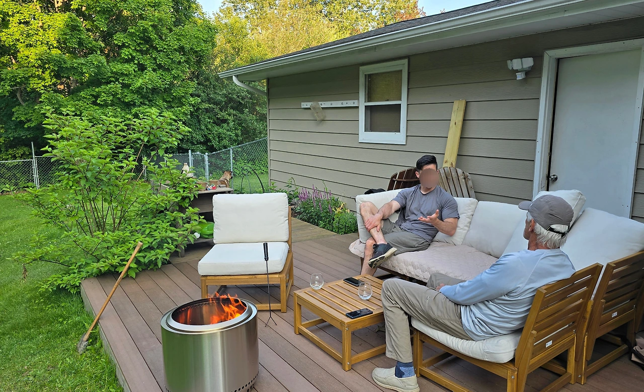 식사 후엔 뒷마당 덱에 둘러앉아 모닥불을 피웠다. 와인을 곁들이며 또 두런두런 이야기를 나누다 보니 어느새 날이 저문다.