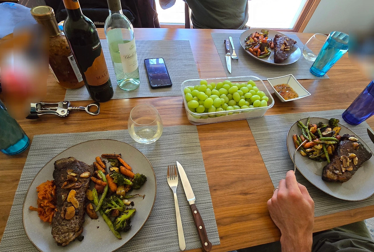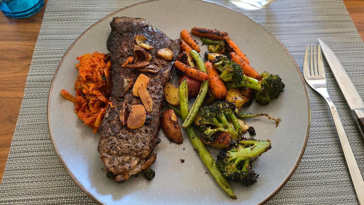 신랑은 미리 재워둔 스테이크를 굽고, 나는 파프리카, 갈릭 파우더 등으로 시즈닝 한 야채를 오븐에 구웠다. 그리고 스테이크를 구울 때면 늘 함께 곁들이는 구운 마늘과 구운 김치도 준비했다. 비싼 레스토랑 부럽지 않게 잘 구워진 스테이크와 내가 만든 사이드 음식들, 쉴 틈 없이 수다를 떨며 즐겁게 저녁식사를 마무리했다. 역시나 시아버지께선 구운 김치까지 싹싹 다 드셨고 신랑과 나도 남김없이 맛있게 먹었다.