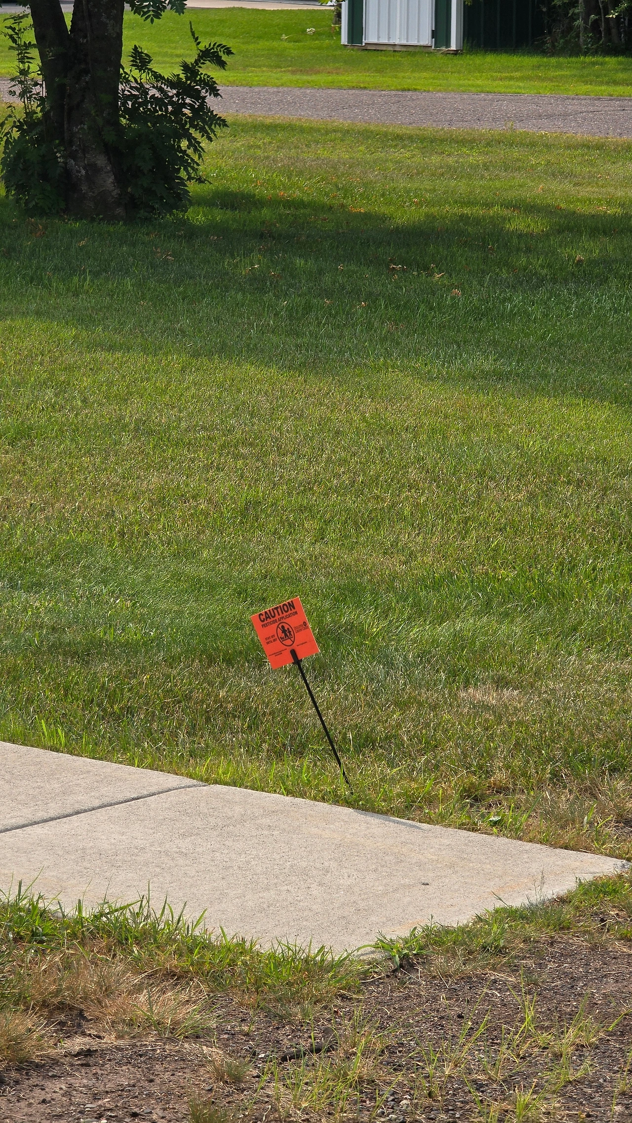 잔디밭에 이런 푯말이 붙어 있는 경우가 있는데 대부분 제초제를 뿌린 경우라 사람과 반려동물들에게 해롭다. 문제는 넓은 잔디밭 한쪽에 작은 표시만 있기 때문에 놓치는 경우가 많다.