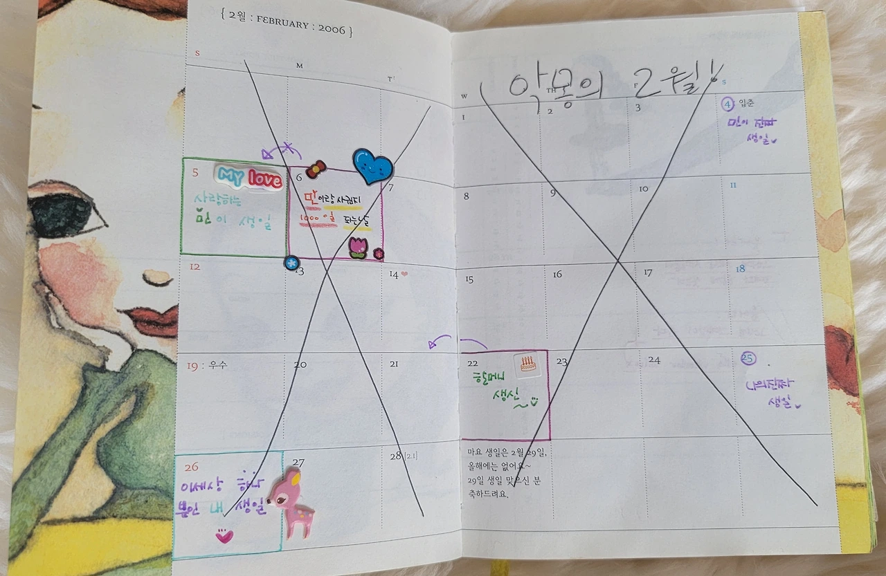 하지만, 2월 월간 계획표로 넘어가자 '악몽의 2월'이란 커다란 글자 아래 다이어리 전체에 크게 엑스자가 그려져 있었다. 남자친구의 생일과 나의 음력 생일이 있었던 2월, 남자친구와 천일이 되던 2월... 그 2월에 남자친구에게 이별통보를 받았던 것이다. 그는 마음이 떠났으니 이제 그만 헤어지자고 했다.