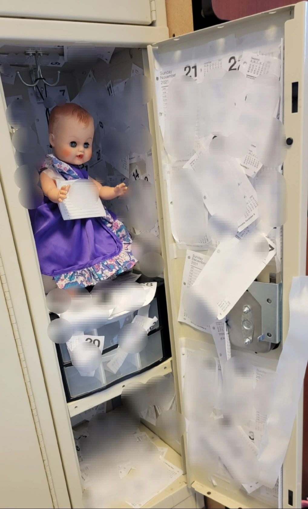 그 후, 나의 보복전이 시작되었다. 우리 시댁 식구들끼리 장난치는 데 사용하는 으스스한 인형과 오피스에 있는 오래된 스케줄 북으로 제이슨의 락커를 꾸민 것이다. 하지만 다음 날, 같이 일하는 동료가 아직 락커를 확인하지 않은 제이슨에게 "제이슨! 아침에 락커 보고 어땠어? 놀랐어?"라고 묻는 바람에 제이슨이 눈치를 채 버렸다.
