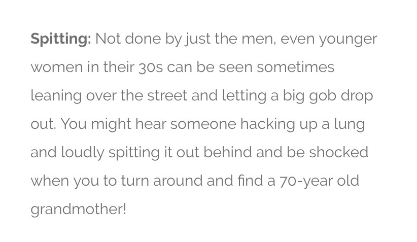 그 중 충격이었던 것이 길거리에서 침, 가래침 뱉기였습니다. ‘카악!’하는, 듣기에도 역겨운 소리와 함께 타액을 길거이에 - 나름 사람들을 피해서 뱉긴 했습니다만- 뱉어내는 사람들이 종종 보였다는 것이죠. 왜 하필 한국에 온지 얼마 안되는 그 시점에 유독 침뱉는 광경을 자주 목격하게 됐는지 모르겠습니다. 가래를 끌어올리는 역겨운 소리없이도 침뱉는 경우도 있었구요.