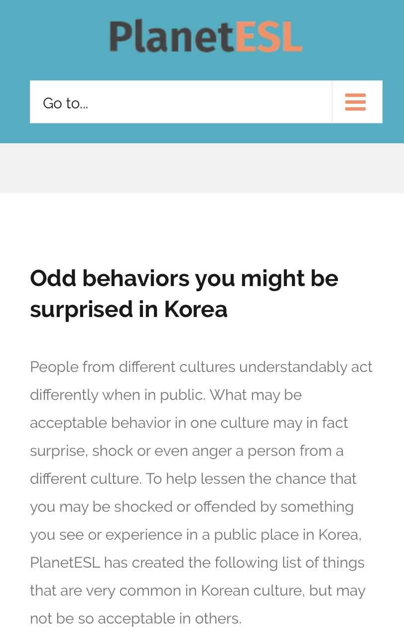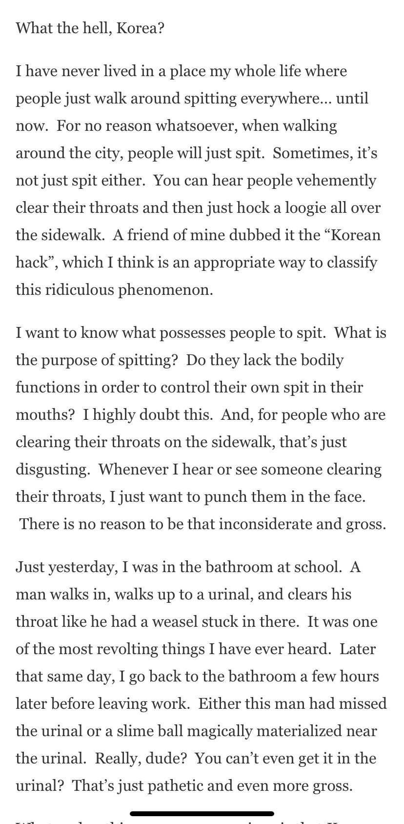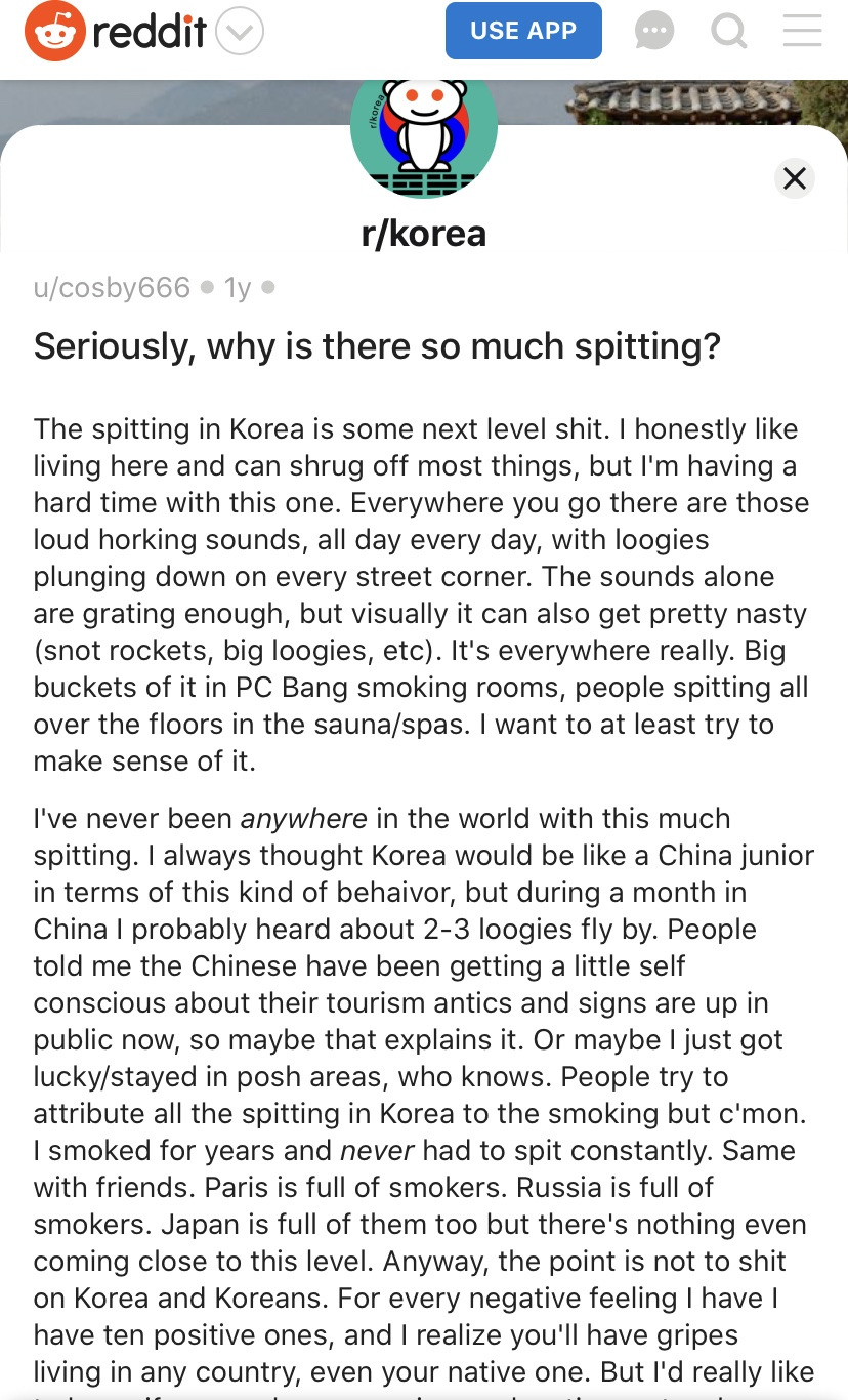 그래서 구글에 ‘spitting in Korea’ 로 서치해 봤습니다. 그런데 Wow! 많은 글들이 있더라구요. 한국에 다녀간 외국인들이 올린 글이 많이 있었고 유튜브 영상까지 있었습니다. 물론, 다들 역겹고 더럽다는 글이었고, 왜 침을 뱉는지 모르겠다는 것이었습니다. 한국에서 영어 원어민으로 영어를 가르치는 사람들을 위한 사이트에는 한국인들의 이상한 행동으로 든 것들 중 하나로 침뱉기가 있더군요. 한국에 가기 전에 충격받지 않도록 미리 한국인들의 ‘이상한’ 행동을 알려주는 겁니다.