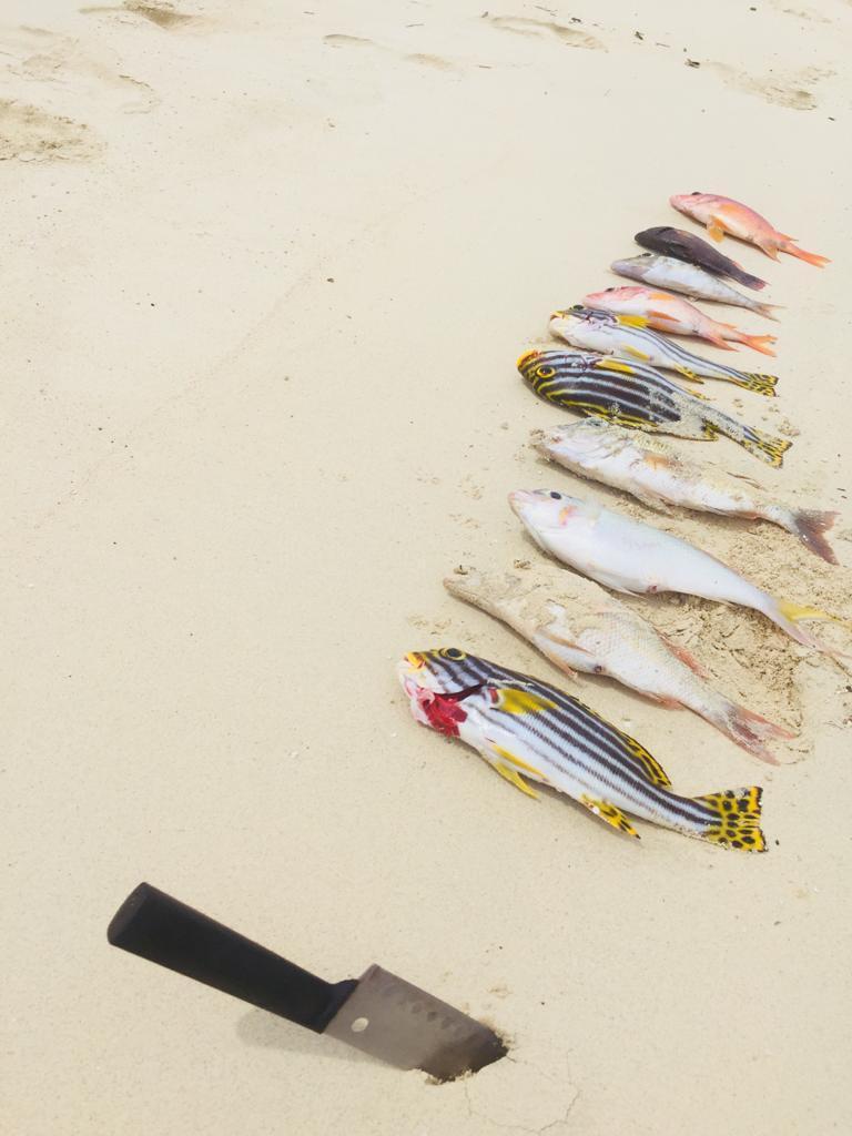 다들 1시간 이상을 바다에 떠 있었다. 얼마 후 배 위에 있던 우리들은 바다낚시를 하기 시작했다. 점심으로 쓸 고기를 낚아야 했다. 난 정말 애썼지만 한 마리도 낚지 못했다. 우리들 중 Nicole이라는 독일 친구는 3마리나 낚아서 모두의 부러움을 샀다. 역시 현지인인 직원들이 많이 낚았다.