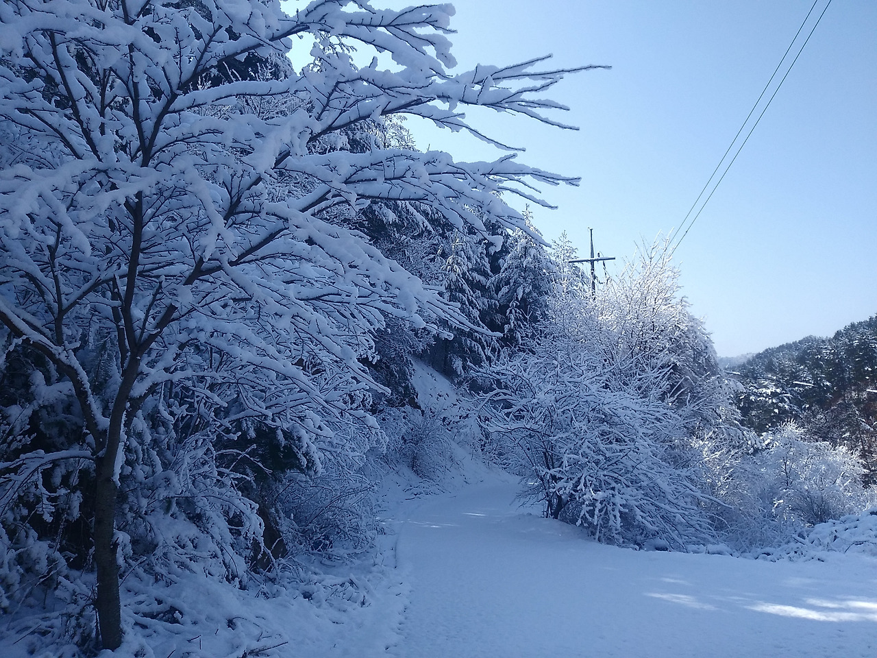 어찌나 펑펑내리는지 봄기운이 돌던 산골은 나무마다 크리스마스 카드 풍경이 되었다.