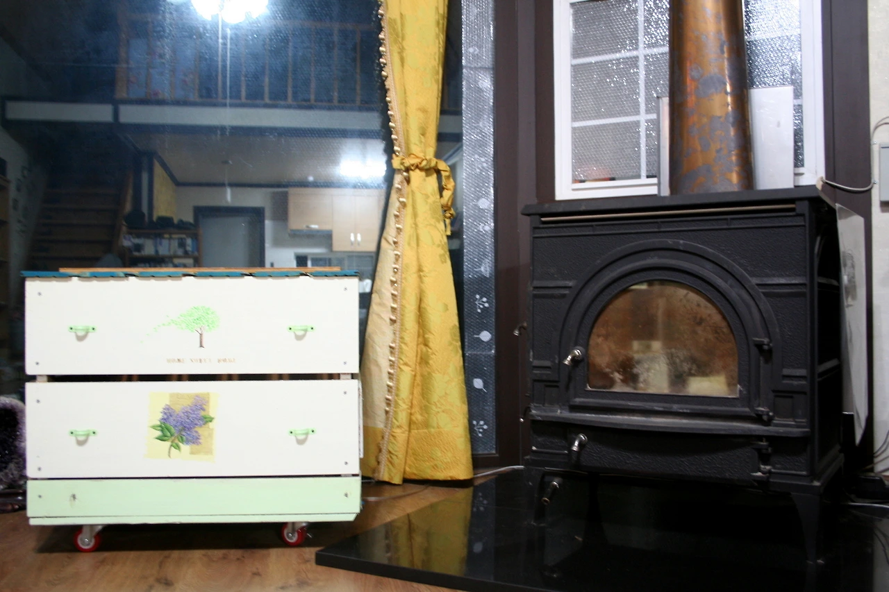 나무를 무식하게 통째로 집어넣어 확확 불을 때는 것이라 벽난로 옆에 큰 헝겊천을 돗자리처럼 깔고 거기에 통나무를 쌓아놓고 땠다.