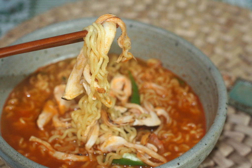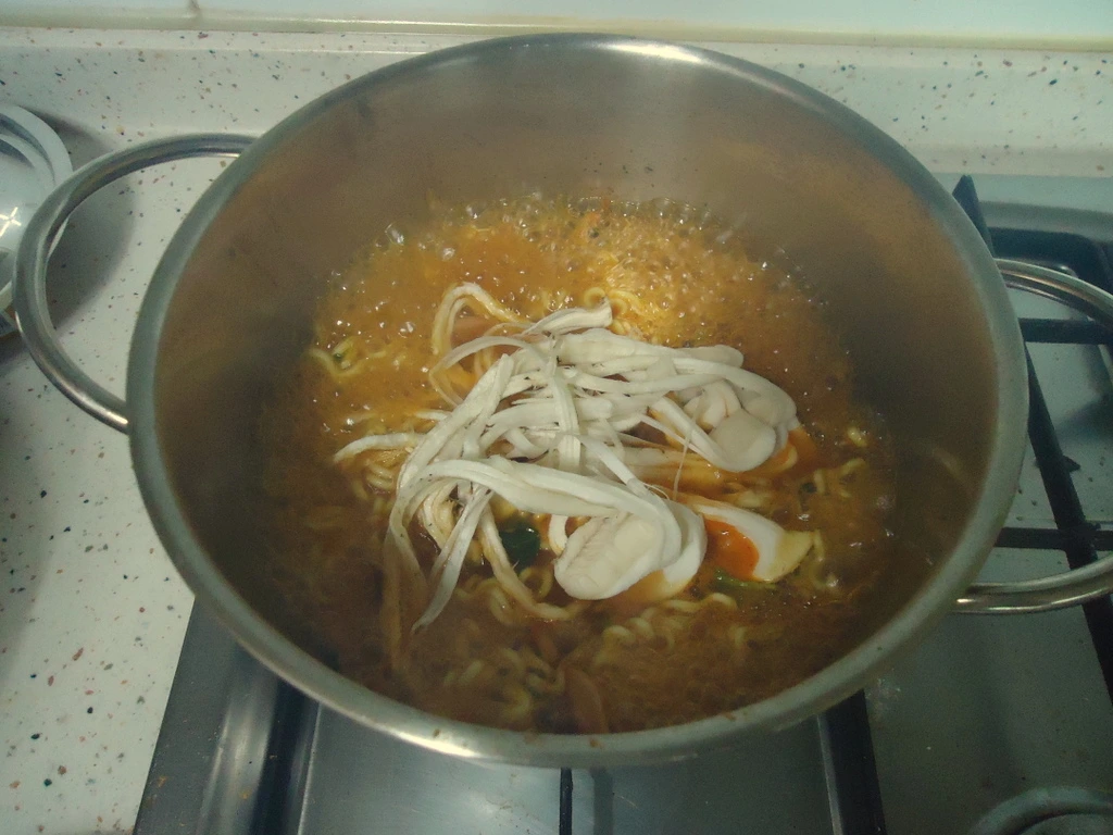 국물이 송이에 잠길 정도로 라면을 눌러준 다음 바로 불을 끈다.