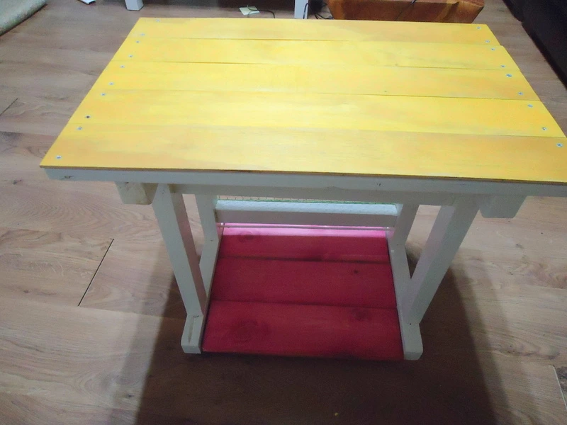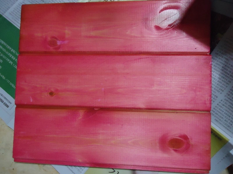 상판은 내가 좋아하는 겨자색을, 하단의 판자는 용감하게 핑크색 스테인을 칠하기로 했다.
