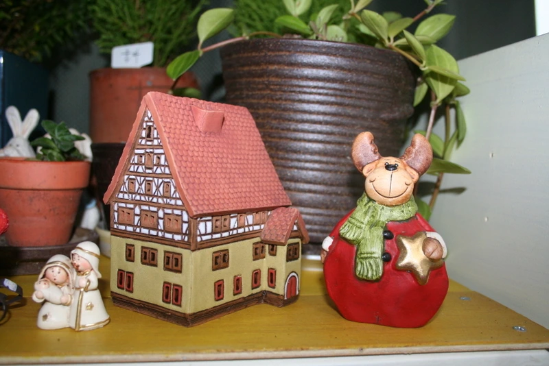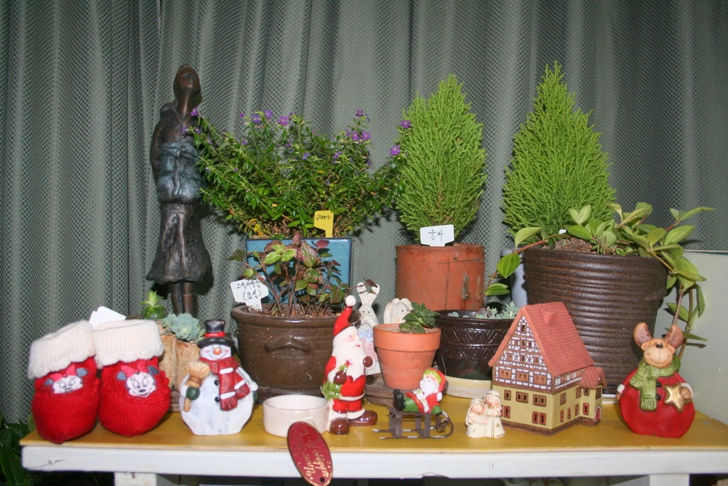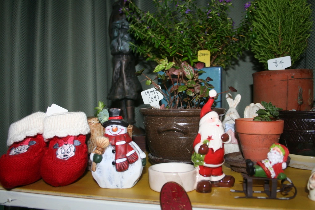 화분 앞에 유럽 배낭여행 갈 때마다 사 온 크리스마스 소품들을 화분 앞에 놓았다.