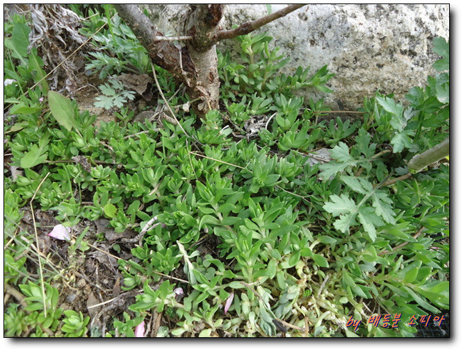 나무 아래, 덤불 속에 있는 돌나물...