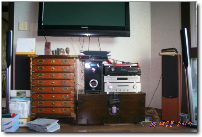 초보농사꾼이 영화볼 때 필요하다며 설치한 4대의 스피커가 거실 네 구석마다 하나씩 길다랗게 서있고, 그것을 관장하는 장치하며 거실 곳곳이 전깃줄로 몸살을 앓고 있었다.