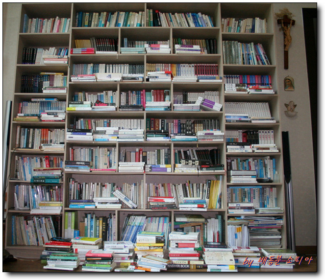 사방이 책꽂이고 사진 외에도 또 책꽂이가 있는데도 다시 바닥에 책이 쌓이기 시작했다.