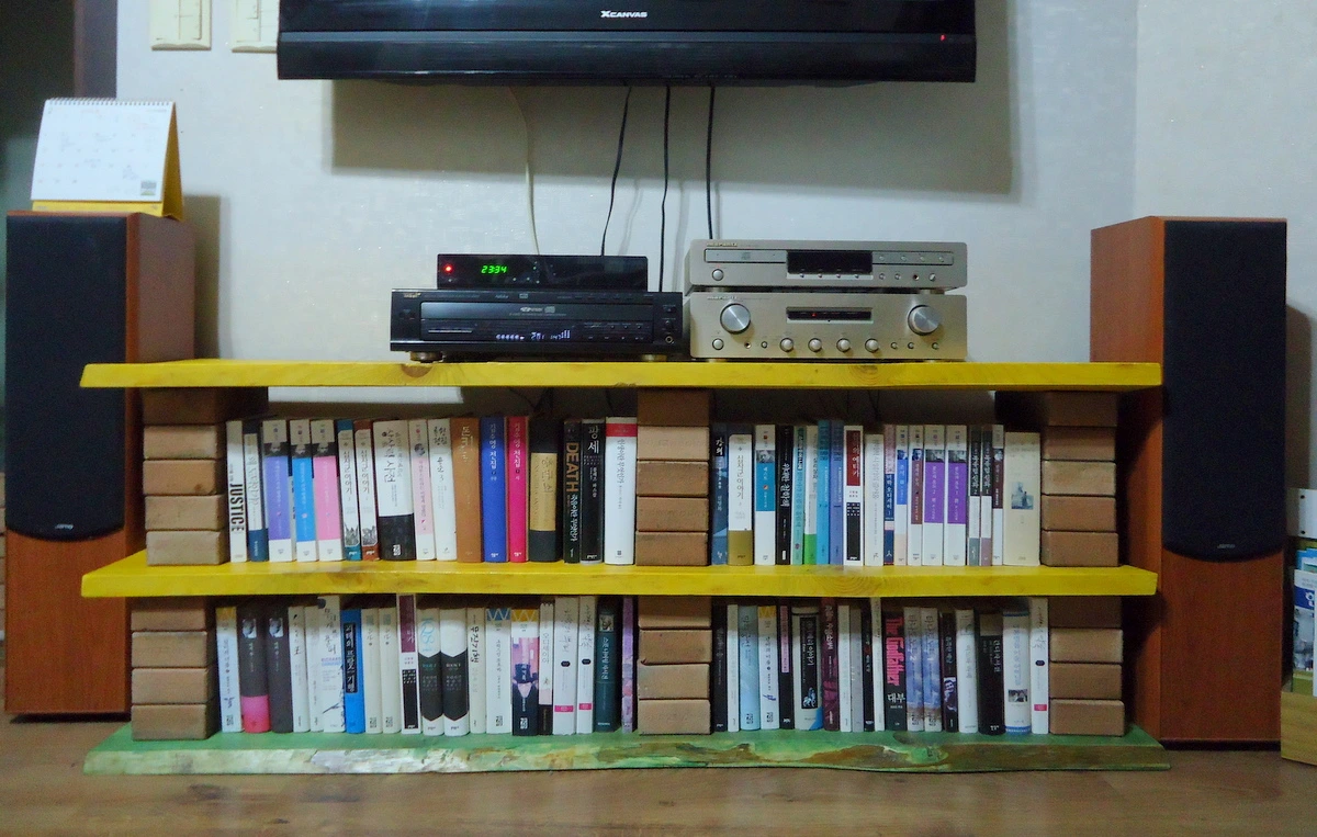 우선 TV 아래의 그곳을 나무와 벽돌로 낮은 책꽂이로 만들고 그 위에 간단한 음향기기만 올려놓기로 했다.