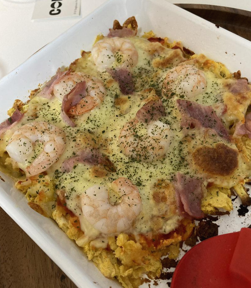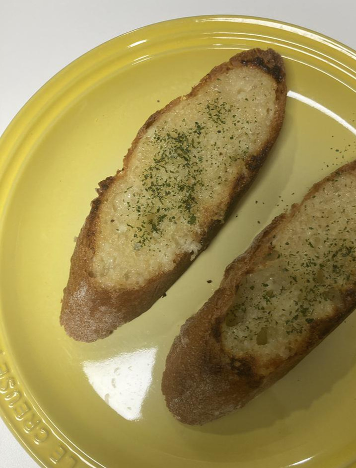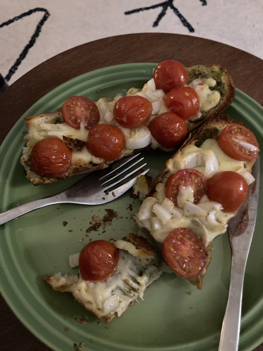 남편이 감바스를 만들고 있다면, 나는 마늘빵을 만들어 생색을 내본다. 충분한 다진 마늘과 꿀, 버터를 한 그릇에 담아 전자레인지에 30초 돌린다. 뜨거운 그릇을 조심히 꺼내어 잘 섞는다. 이것을 바게트 위에 펴 발라, 치즈토스트 모드로 4분 굽는다. 따끈하고 달달하다. 이 정도 마늘향은 나야 K-마늘빵이 될 수 있다. 마지막 조합은 맨 빵 위에 바질페스토를 바르는 것으로 시작한다. 다진 양파와 반씩 자른 토마토를 올리브유, 소금, 후추와 섞어 빵 위에 올린다. 피자치즈를 뿌리고, 200도에 10분. 그럴싸한 이름이 있을 것 같은데 잘 모릅니다.