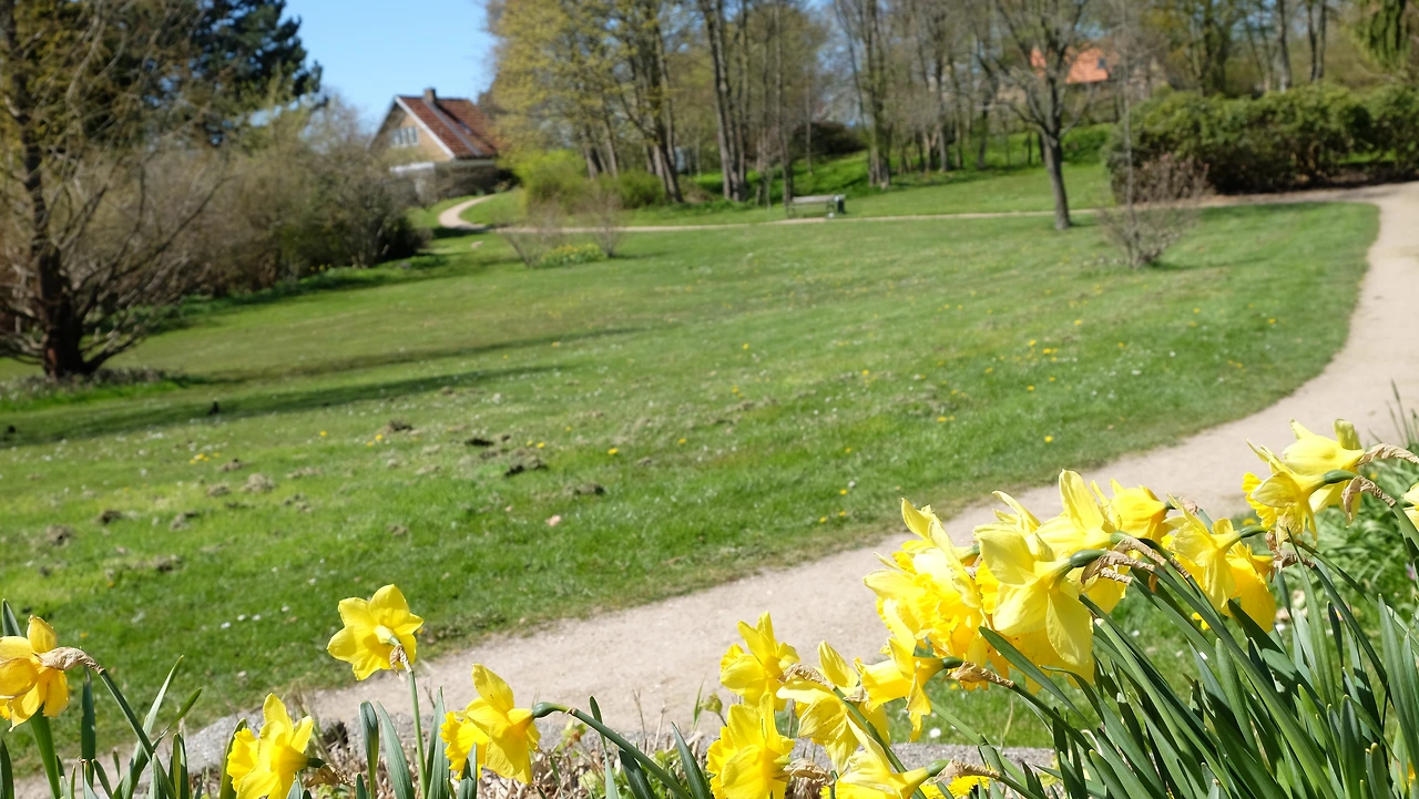 루이지애나 까페로 가는 길, 넓은 잔디로 이루어진 푸른 정원이 있어요.