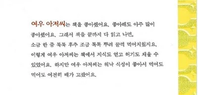 자기가 쓴 글을 읽어보니 세상 어떤 책보다 재미있다. 먹어보니 세상 모든 책들보다 맛있다. 책을 지속적으로 읽는 사람들은 어느 순간 글을 쓰고 싶은 욕망에 도달하게 된다. 이 여우는 이러한 사람의 심리를 대변한다. 글을 많이 읽을수록 많이 쓰는 연습을 해야할 것이다. 그러면 상상의 나래가 머리 속에 펼쳐지고, 즐거운 상상 속에 나 자신만의 글이 완성되는 것이겠지..