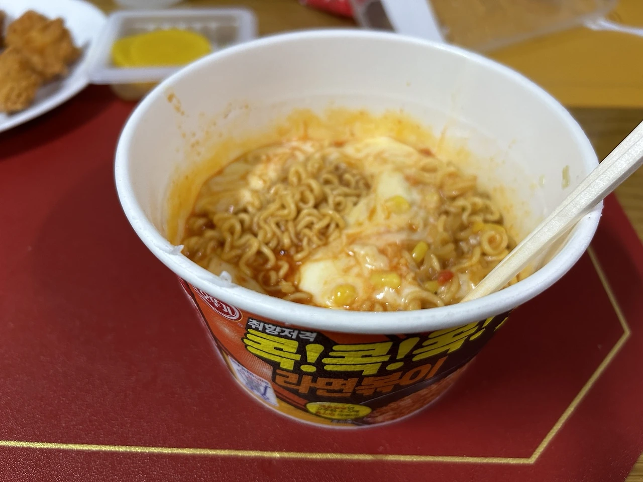 편의점 컵라면이 질리니까 라볶이 라면과 불닭볶음면을 섞었다. 매운 걸 잘 못 먹는데 여기다 모차렐라 치즈와 통조림 콩을 넣으니 적당히 매워서 맛있게 먹었다. 떡볶이가 먹고 싶을 때 가끔씩 생각나는 맛이다.