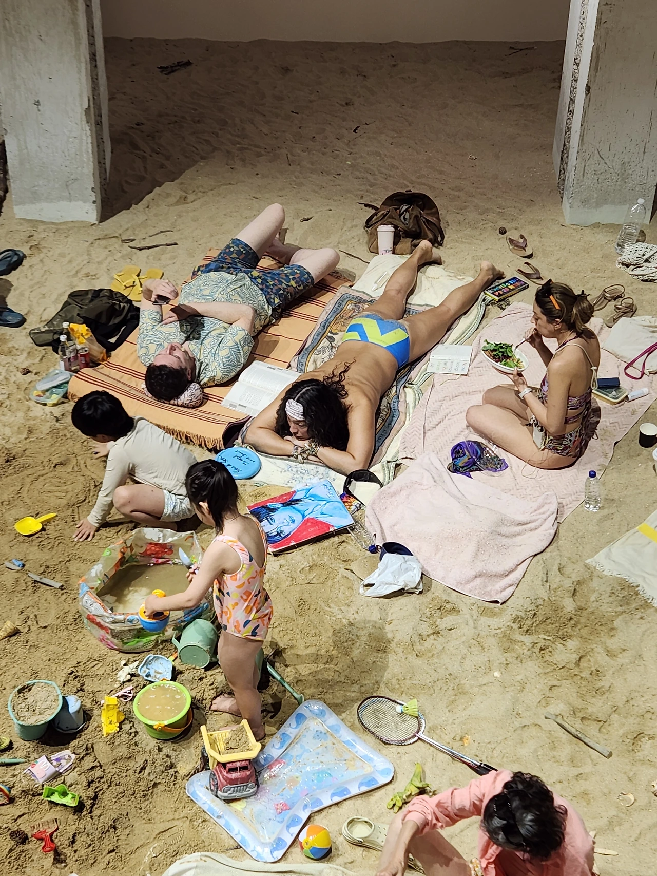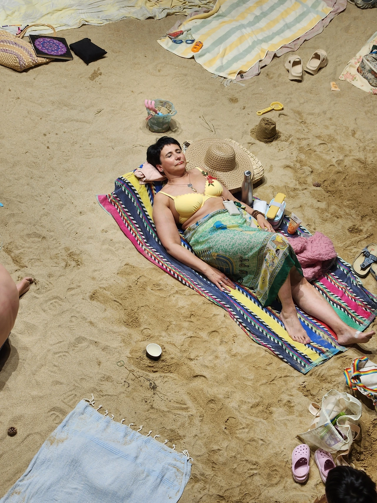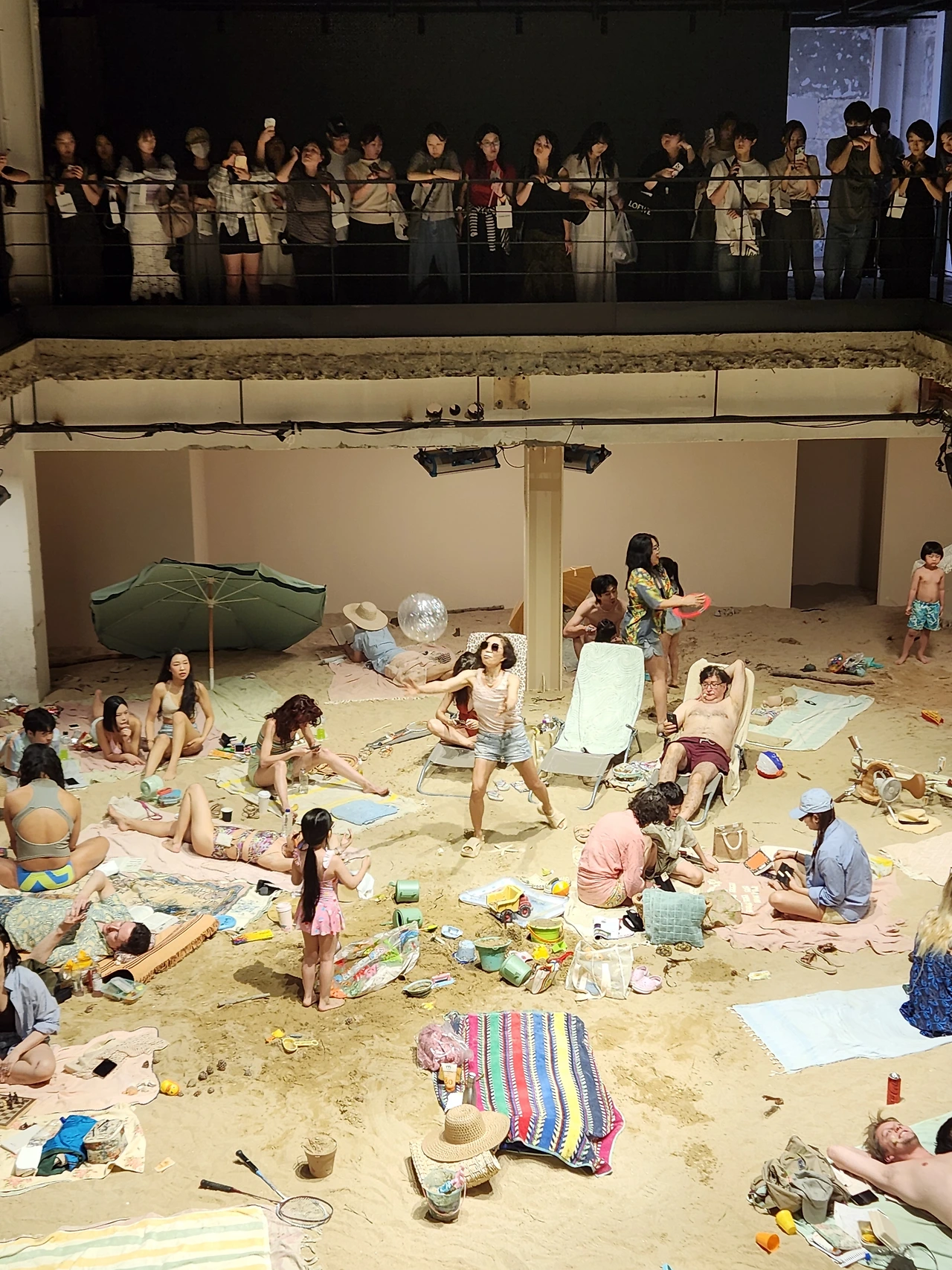 실제 수 톤에 이르는 모래를 깔아 조성된 실내 해변에서 사람들은 일광욕을 즐기고 책을 읽는다. 아이들은 모래놀이를 하고 강아지도 여름날을 즐기고 있다. 그러다 하나둘씩 자기 일상을 노래로 부르는데, 가사와 상황이 어쩐지 불편하고 위태롭다.