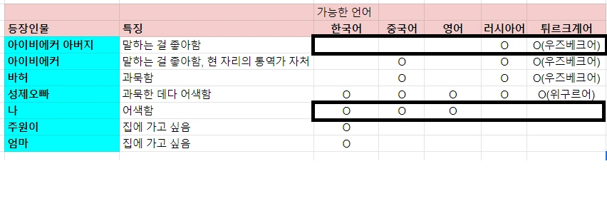 나의 대화 소재도 슬슬 바닥날 무렵, 대화의 표적은 성제 오빠에게로 향했다! 아이비에커네 아버지가 성제오빠에게 "아직 결혼하지 않으셨다고 들었는데, 우즈베키스탄 여자 소개해줄까요?"라고 물은 것이다. 곤혹스러워하는 성제 오빠를 대신해서 내가 성제 오빠가 좋아하는 이상형을 구글 번역기로 알려주자, 다들 흥미로워하며 진심으로 찾아봐주겠다고 했다. 성제 오빠의 우즈베키스탄 여자 찾기 이야기로 10분 즈음은 대화의 공백을 채울 수 있었다. 나중에는 내가 식탁에 올려있던 매운 고추를 잘못 먹어서 헥헥 대느라고, 다들 그걸 보면서 한참 웃는 것으로 또 시간을 때울 수 있었다.