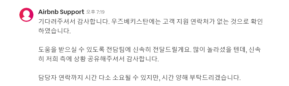내가 호텔 브로슈어를 사진 찍어서 현재 리얼 호텔 전화번호로 연락 줄 수 있냐고 에어비앤비에 요청했지만, 에어비앤비 측에서는 에어비앤비에 등록된 호스트 전화번호 외에는 전화할 수 없다고 단호하게 연락이 왔다. 그러다 한국 퇴근시간이 되어 나의 에어비앤비 요구사항은 다른 담당자로 이관되었다. 이제 무한대로 기다려야 하는 상황이 되었다.