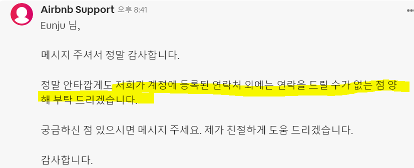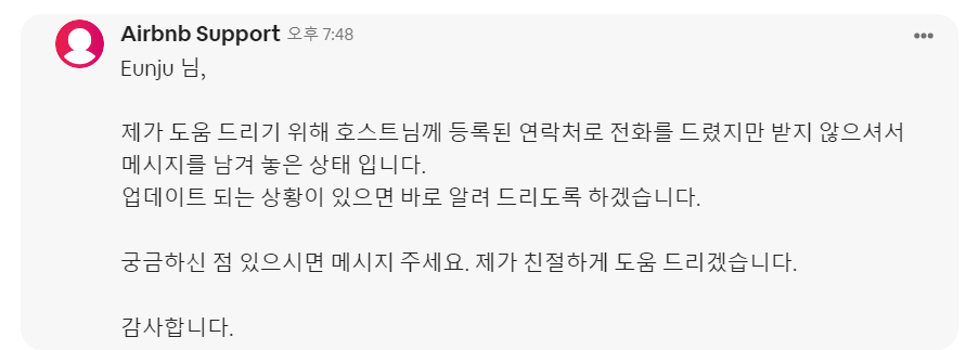 에어비앤비 측에서는 문제 해결을 위해 에어비앤비에 등록된 호스트 전화번호로 전화도 걸었지만, 그 아는 형의 연락처로 등록이 되었는지 아무도 전화를 받지 않았다.